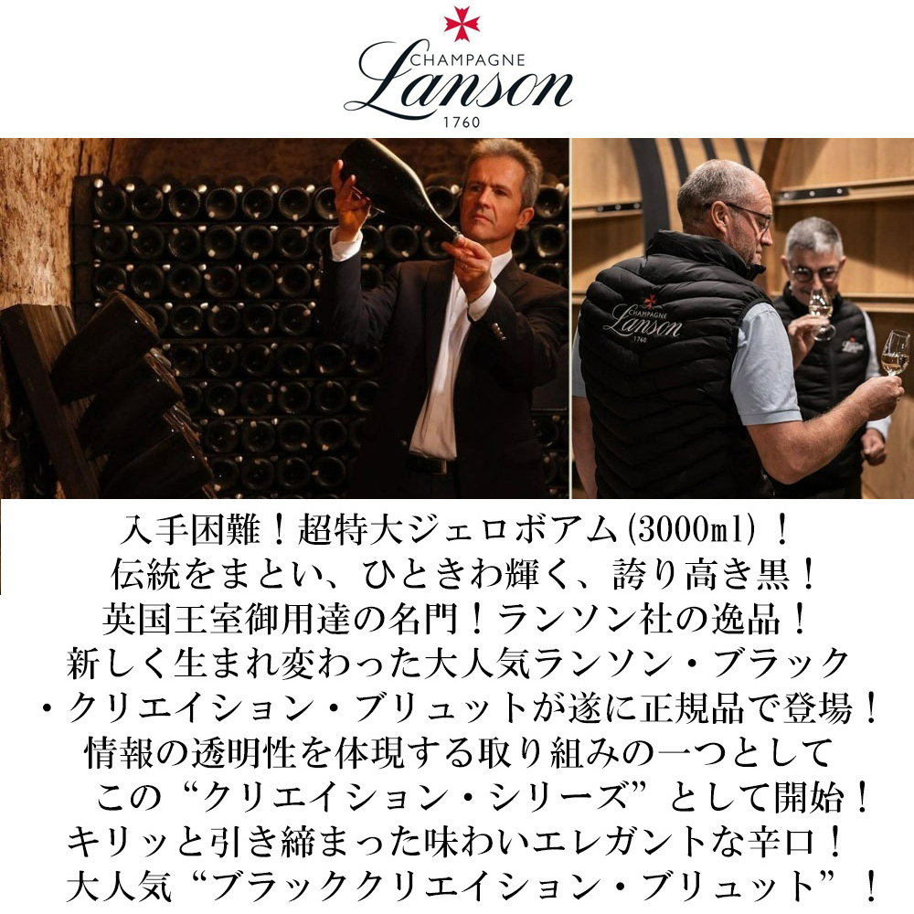 あの大人気シャンパーニュのジェロボアム(3000ml)超大型サイズが待望入荷!名門中の名門!英国王室御用達!の名門ランソン社の逸品!あまりに有名!キリッと引き締まったエレガントな辛口!大人気ブラック・ラベルが「ランソン・ブラック・クリエイション・ブリュット」に名称変更され遂に正規品で登場!