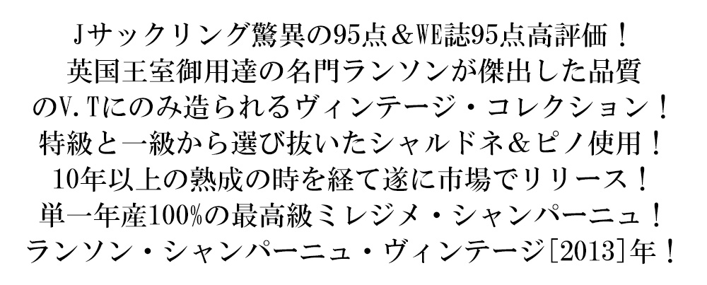 このランソン・シャンパーニュ・ヴィンテージ・ブリュット[2013]年は、「グラン・クリュとプルミエ・クリュの中から最高のブドウだけを選択することで、エレガンスと複雑性が備わります。」「ランソンはマロラクティック発酵を行わないシャンパーニュ元来の醸造方法を堅持することで、長年比類ないフレッシュさを持ち続けるワインを造っています。」「ヴィンテージはセラーで10年以上熟成することで、ユニークなアロマの凝縮度が生まれます。」グラン・クリュ&プルミエ・クリュ100%のピノ・ノワール53%とシャルドネ47%(ピノ・ノワールはアイ、ブージー、ヴェルズネ、マルイユ・シュール・アイ。シャルドネはアヴィーズ、ル・メニル・シュール・オジェ、トレパイユ)!9年(108ヶ月)以上の熟成!ドサージュ7.5g/Lで造られる究極ミレジメ・シャンパーニュ!