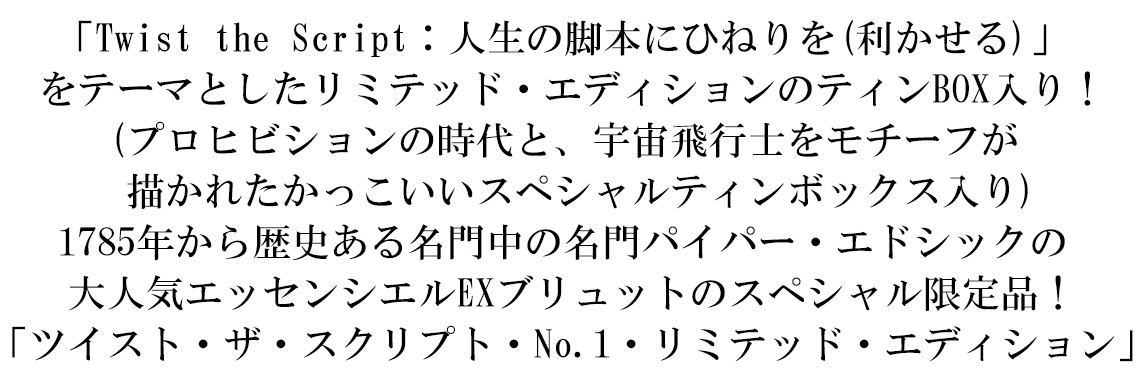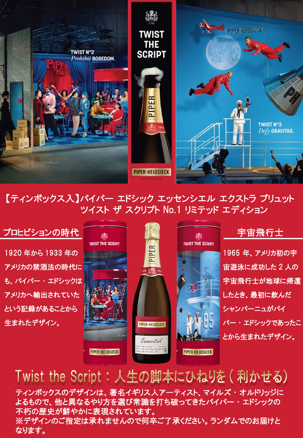 数量限定作品!大人気シャンパーニュ愛好家大注目!「Twist the Script:人生の脚本にひねりを(利かせる)」をテーマとした、リミテッド・エディションのスペシャルティンボックス入りの限定品!「パイパー・エドシック・エッセンシエル・エクストラ・ブリュット・ツイスト・ザ・スクリプト・No.1・リミテッド・エディション・ティンボックス」が限定で登場!ティンボックスのデザインは、著名イギリス人アーティスト、マイルズ・オルドリッジによるもので、他と異なるやり方を選び常識を打ち破ってきたパイパー・エドシックのエッセンスが鮮やかに表現されています!今回の2種類のデザインは、プロヒビションの時代と、宇宙飛行士をモチーフにしています!1920年から1933年のアメリカの禁酒法の時代にも、パイパー・エドシックはアメリカへ輸出されていたという記録があること、また、1965年、アメリカ初の宇宙遊泳に成功した2人の宇宙飛行士が地球に帰還したとき、最初に飲んだシャンパーニュがパイパー・エドシックであったこと!から、これらのデザインが生まれました!あのマリリン・モンローが愛したシャンパーニュとして、又、鮮やかなレッドカラーのエチケットと、各国のエアーラインでも多数オン・リスト!!また“The Movie Champagne”の異名とともにカンヌ国際映画祭の公式シャンパーニュとしても有名!!超人気パイパーが装い新たに新登場!1785年から歴史のある名門!人気シャンパーニュ!各国の王室御用達として名を馳せるパイパー・エドシック!“ピペ”の名とともにあまりに有名!最高醸造責任者でありIWCでスパークリングワインメーカー・オブ・ザ・イヤーに選出されたレジス・カミュによるあのパイパー・ブリュットが名前を新たに“エッセンシエル・キュヴェ・ブリュット”として蔵出しでついに登場!この「エッセンシエル・キュヴェ」でデカンタ・ワールド・ワイン・アワード2017にてプラチナ賞で驚異の95点獲得!フォルスタッフ・マガジン91点!ベタンヌ&ドゥソーヴ17/20点!Richard juhlinの「4000シャンパーニュ」でも最高の4つ星を獲得!Le Guide Larousse du Champagne2015版でも★★★3つ星でノーマルのブリュットで★★Wスター獲得!しかもノーマルブリュットでは様々な年のワインブレンドを使ったものがこのエッセンシエルでは、各収穫ヴィンテージをベースになんと贅沢にも10~20%のリザーブワインをブレンド!しかも熟成期間も24ヶ月から48ヶ月に最低熟成期間を延長!しかもドザージュが11g/Lだったものが6g/Lの本格辛口仕様に!しかも表ラベルにはキュヴェ・ナンバーとデゴルジュマンの年月、レジス・カミュ氏のクレジット(サイン)も明記するという徹底したこだわり!淡い黄金色の贅沢な泡が立ち昇り、美しい流れ星のようにはじける!みずみずしく贅沢で、ユニークなミネラルの個性と共に微かなヨードの香り!軽やかで新鮮なテクスチャーは、ふんわりとした織物のモスリンを思わせる!柑橘類やリンゴ、白い果実のいきいきとした香りと共にアーモンドやフルーツケーキのような力強く、甘く優美な香りが広がり、ワインが長い間静かに熟成していたことを感じさせる究極本格辛口シャンパーニュ!プロヒビションの時代と、宇宙飛行士をモチーフが描かれたリミテッド・エディションのスペシャルティンボックス入りの限定品で正規代理店輸入品で待望の少量入荷!プレゼントにもオススメです!