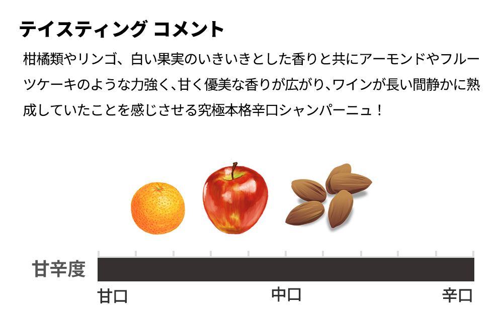 柑橘類やリンゴ、白い果実のいきいきとした香りと共にアーモンドやフルーツケーキのような力強く、甘く優美な香りが広がり、ワインが長い間静かに熟成していたことを感じさせる究極本格辛口シャンパーニュ!