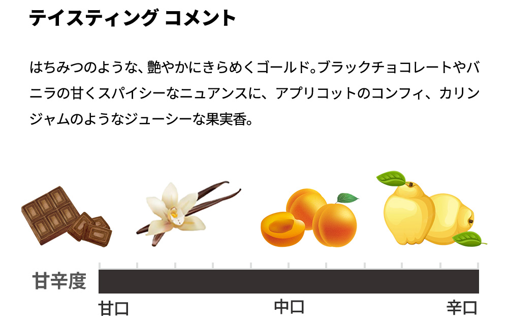 はちみつのような、艶やかにきらめくゴールド。ブラックチョコレートやバニラの甘くスパイシーなニュアンスに、アプリコットのコンフィ、カリンジャムのようなジューシーな果実香。セイヨウサンザシなど白い花の爽快感。じっくり時間をかけて撹拌された上質なバター “ブール・ド・バラット“や、熟したイチジクの風味。気品あるシャルドネの果実味が強い存在感をみせて口中を満たす。シャープなミネラルの風味がアイ村らしい、フィネスにあふれるブラン・ド・ブラン シャンパーニュ。