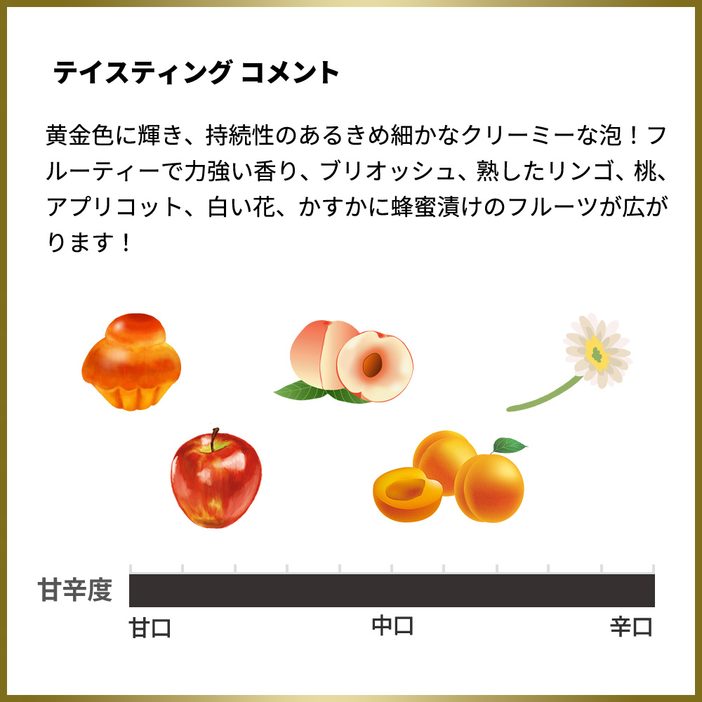 黄金色に輝き、持続性のあるきめ細かなクリーミーな泡!フルーティーで力強い香り、ブリオッシュ、熟したリンゴ、桃、アプリコット、白い花、かすかに蜂蜜漬けのフルーツが広がります!美しく熟成され力強さとエレガントさがバランス良くまとめられたグレイトヴィンテージ2018年ミレジム・シャンパーニュが限定で少量入荷!