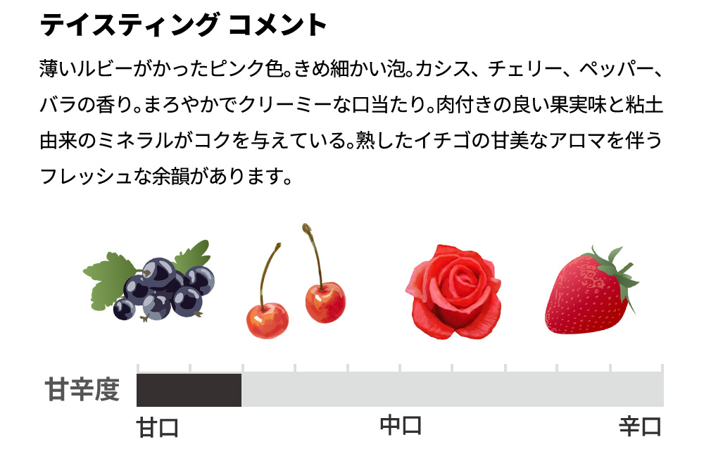 薄いルビーがかったピンク色。きめ細かい泡。カシス、チェリー、ペッパー、バラの香り。まろやかでクリーミーな口当たり。肉付きの良い果実味と粘土由来のミネラルがコクを与えている。熟したイチゴの甘美なアロマを伴うフレッシュな余韻があります。もちろん人気生産者元詰RMシャンパーニュロゼが蔵出し作品で限定少量入荷!
