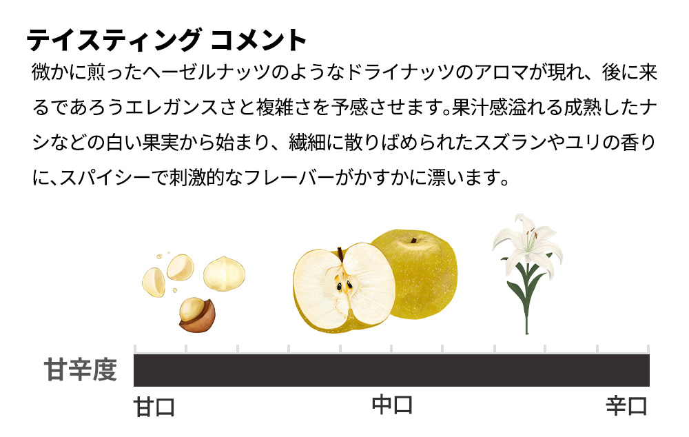 輝く黄金色。繊細で刺激的、微かに煎ったヘーゼルナッツのようなドライナッツのアロマが現れ、後に来るであろうエレガンスさと複雑さを予感させます。果汁感溢れる成熟したナシなどの白い果実から始まり、繊細に散りばめられたスズランやユリの香りに、スパイシーで刺激的なフレーバーがかすかに漂います。繊細な口当たりを持ち、非常に魅惑的で、複雑、そして非常に素晴らしい余韻を持ちます。