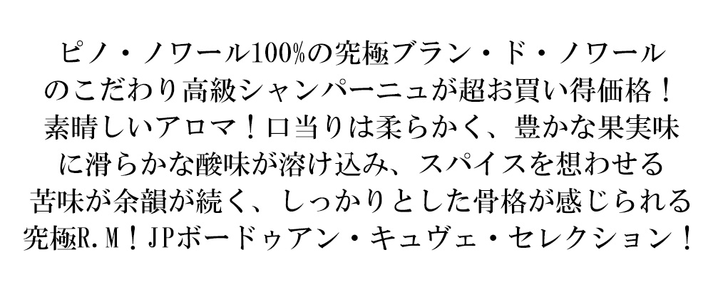口当たりは柔らかく、豊かな果実味に滑らかな酸味が溶け込み、スパイスを想わせる苦味が余韻が続く、しっかりとした骨格が感じられる究極シャンパーニュ!ピノ・ノワール100%の究極ブラン・ド・ノワール・シャンパーニュ(ホワイトラベル)がこのプライスは超お買い得価格!