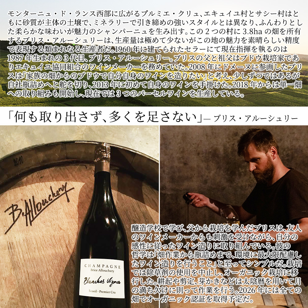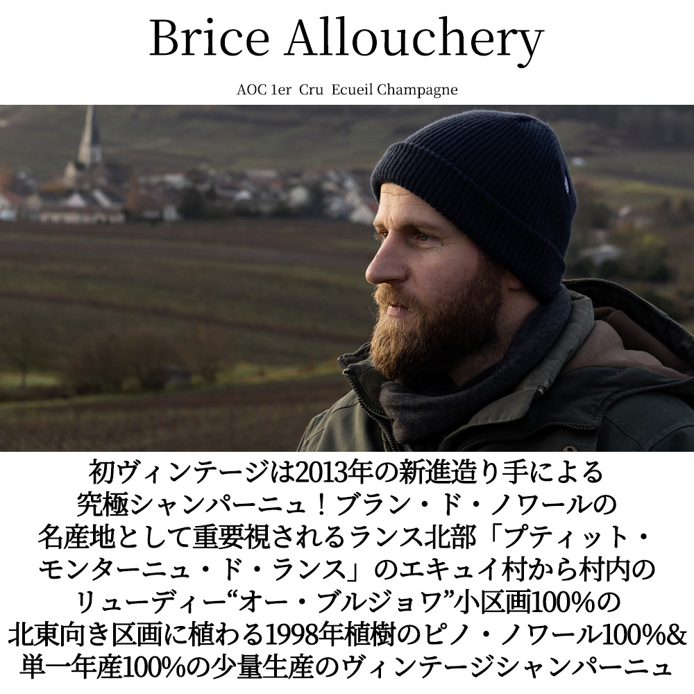 超入手困難!大人気高級RM(生産者元詰)シャンパーニュ辛口愛好家大注目!モンターニュ・ド・ランス(Montagne de Reims)のプルミエ・クリュの一級エキュイ村100%のブラン・ド・ノワール(ピノ・ノワール100%)!しかもブラン・ド・ノワールの名産地として重要視されるランス北部から西側の丘陵地帯に位置する「プティット・モンターニュ・ド・ランス」(小モンターニュ・ド・ランス)と呼ばれる大人気地域にあり、しかもランスの西側の8つのプルミエ・クリュの村のひとつエキュイユ村100%の生産者元詰R.Mシャンパーニュ!砂質の土壌が特徴で、柔らかな味わいが魅力のしかもエキュイ村のリューディー“オー・ブルジョワ”小区画100%。自然派・ビオ(オーガニック)の一級ピノ・ノワール100%・ブラン・ド・ノワール!しかもドサージュほぼゼロ(ドサージュわずか0.93g/L)のエクストラ・ブリュット・シャンパーニュ!ピノ・ノワールのフィネスと深みを余すところなく引き出した見事なブラン・ド・ノワール。造り手は「何も取り出さず、多くを足さない」ことをモットーに、エキュイユ村とサシー村の砂質土壌由来のふんわりと広がる華やかさを美しく表現。生産量は非常に少なく、まだまだ“無名”でありながらも、既に入手困難な生産者のひとり。(初ヴィンテージは2013年の新進造り手)このブリス・アルーシュリー・シャンパーニュ・プルミエ・クリュ・一級・サシー(Sacy)・リューディー“オー・ブルジョワ”ミレジメ[2019]年・生産者元詰・RM (3代目ブリス・アルーシュリー家)はプルミエ・クリュのエキュイユ(1er CruのEcueilのリューディー“オー・ブルジョワ”小区画100%)に植わるピノ・ノワールから生み出されるブラン・ド・ノワール(オーク樽で発酵、500L樽(新樽30%)で10ヶ月&瓶熟41ヶ月、年産わずか2004本のみの少量生産!砂質&シルト質の土壌で、主に東と北東向きの区画。土壌由来のエアリーなキャラクターに冷涼地のニュアンスがあるスタイルに仕上げます。エキュイユで砂質土壌からできるシャンパーニュの柔らかさ、綺麗な酸の伸び方は「サヴァール」に通じるものがあり、皆様をご満足いただける味わいになっていると思われます。)エキュイ村内のリューディー“オー・ブルジョワ”小区画100%の北東向き区画に植わる1998年植樹のピノ・ノワール100%&単一年産100%のヴィンテージシャンパーニュ。熟したリンゴや黄色い果実に香ばしいブリオッシュのニュアンス。柔らかな輪郭にきめ細やかな泡が美しく溶け込んでいる。旨味を伴う余韻は非常に長い。もちろん正規品の素晴らしい状態で限定少量入荷!