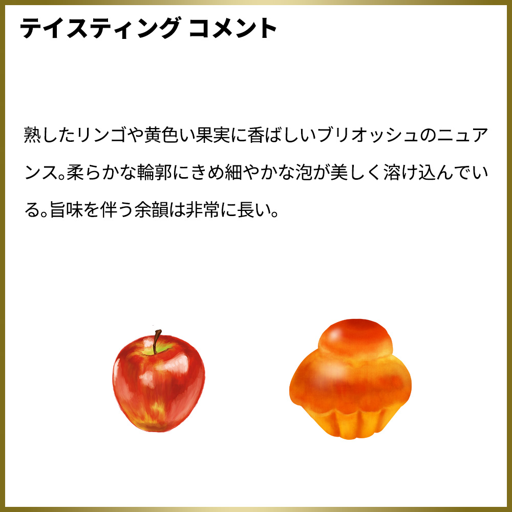 熟したリンゴや黄色い果実に香ばしいブリオッシュのニュアンス。柔らかな輪郭にきめ細やかな泡が美しく溶け込んでいる。旨味を伴う余韻は非常に長い。もちろん正規品の素晴らしい状態で限定少量入荷!