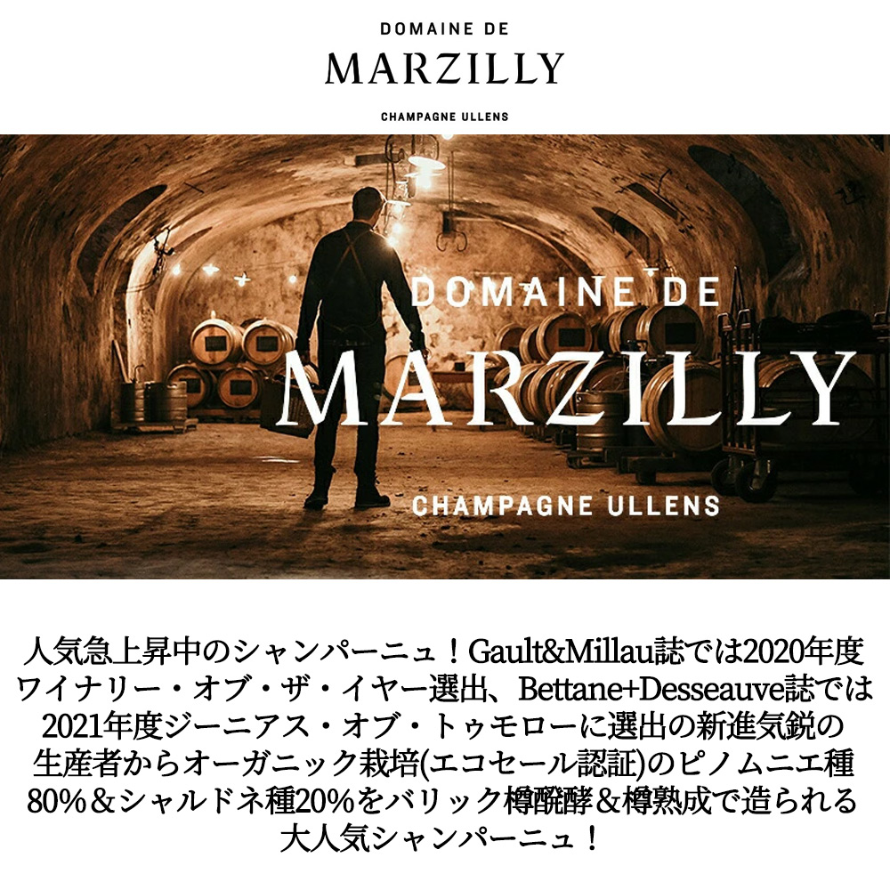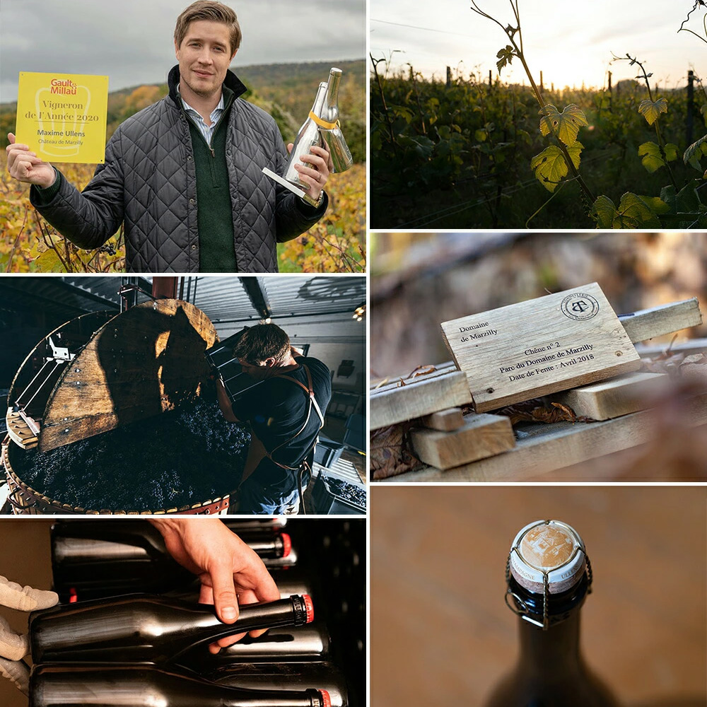 ドメーヌ・ド・マルジリーは、シャンパーニュ地方の最北端マッシフ・ド・サンティエリー(Massif de Saint-Thierry)にある絵画のように美しい緑に囲まれたエルモンヴィル村(Hermonville)から程近いリュ・ディ「マルジリー(Marzilly)」に畑を所有している。若いベルギー人のマキシム・ユランス(Maxime Ullens)が創業したこのドメーヌは家族経営で、地域の伝統と地元の生物多様性を尊重しながら個性豊かなシャンパーニュを生産している。ドメーヌの歴史はマキシムと彼の父親が、廃墟と化したシャトー・ド・マルジリー(Chateau de Marzilly)を2012年に手に入れたところから始まった。数十年間放置されていた12世紀のこの建物に魅了された彼らは、かつての栄光を取り戻そうと決意し、再建工事を開始した。シャトーの庭園で行われた土壌分析と地元の資料を研究することにより、一家はマルジリーのブドウ栽培の過去について詳細を知る機会を得て、そのポテンシャルに確信を持つようになった。この地域の豊かな歴史と伝統的な醸造方法に触発されたマキシムは、ベルギーでの史跡修復というキャリアに完全に終止符を打ち、妻のアンナとともに新しいワイナリーを設立するという挑戦を受け入れた。マキシムは、産地に誇りを持ち、明確なゴールを掲げている。それは、地元の資源を活用し、この地域の伝統的なノウハウを尊重しながら、マルジリーとマッシフ・ド・サンティエリーの文化的・歴史的遺産を前面に押し出すということだ。