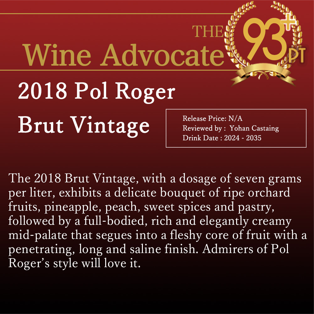 『2018年のブリュット・ヴィンテージは、1リットルあたり7グラムのドサージュで、熟した果樹園の果実、パイナップル、桃、甘いスパイス、ペストリーのデリケートなブーケを示し、フルボディでリッチ、エレガントでクリーミーな中盤の味わいが続き、果実の肉厚な核へと移行し、突き抜けるような長く塩味のあるフィニッシュへと続く。ポル・ロジェのスタイルを愛する人にはたまらない。』と激賞!