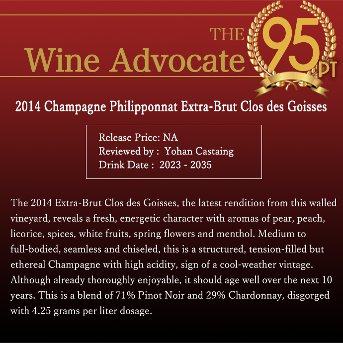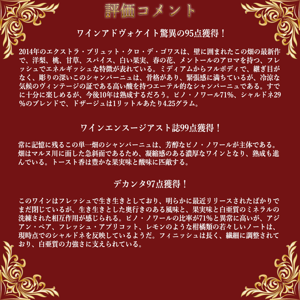 ずばりシャンパーニュのロマネ・コンティとも評される至高の一本!“クロ・デ・ゴワセ”の高評価グレイトヴィンテージ[2014]年!究極高級ヴィンテージ・シャンパーニュが限定で、しかも豪華ギフト箱入りで、しかも正規代理店輸入品で限定少量入荷!