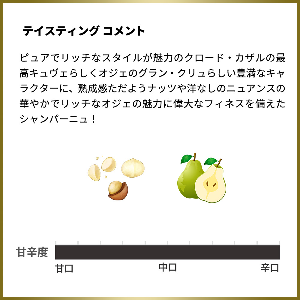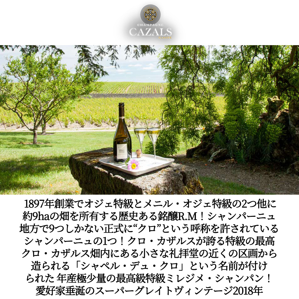 オジェの豊満なキャラクターが華やかに表現されたリッチなグラン・クリュのクロ・シャンパーニュ!クロード・カザルが誇るグラン・クリュ・特級の最高畑“クロ・カザルス”の畑から得られた最高級シャルドネ!
