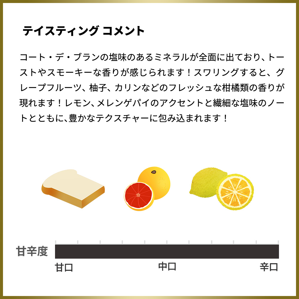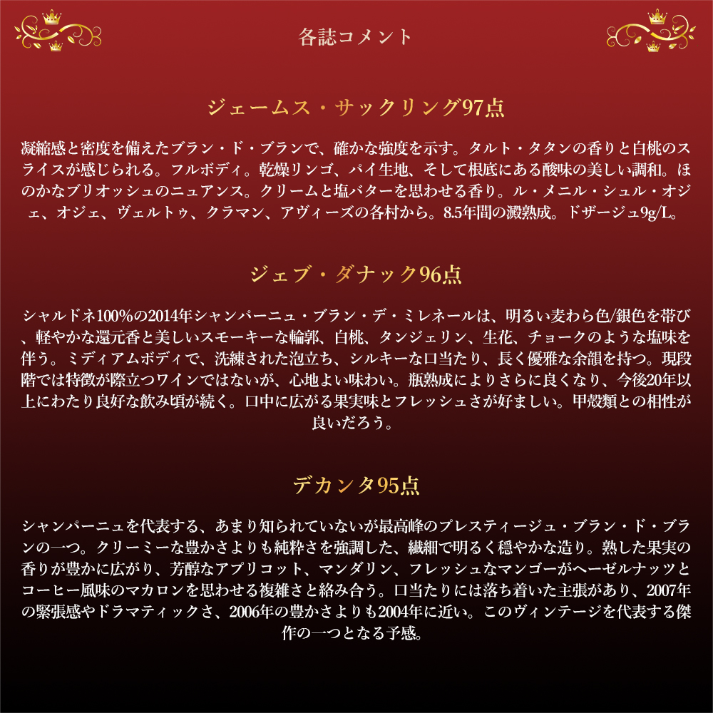 ジェームス・サックリング97点でコメントは『凝縮感と密度を備えたブラン・ド・ブランで、確かな強度を示す。タルト・タタンの香りと白桃のスライスが感じられる。フルボディ。乾燥リンゴ、パイ生地、そして根底にある酸味の美しい調和。ほのかなブリオッシュのニュアンス。クリームと塩バターを思わせる香り。ル・メニル・シュル・オジェ、オジェ、ヴェルトゥ、クラマン、アヴィーズの各村から。8.5年間の澱熟成。ドザージュ9g/L。』!