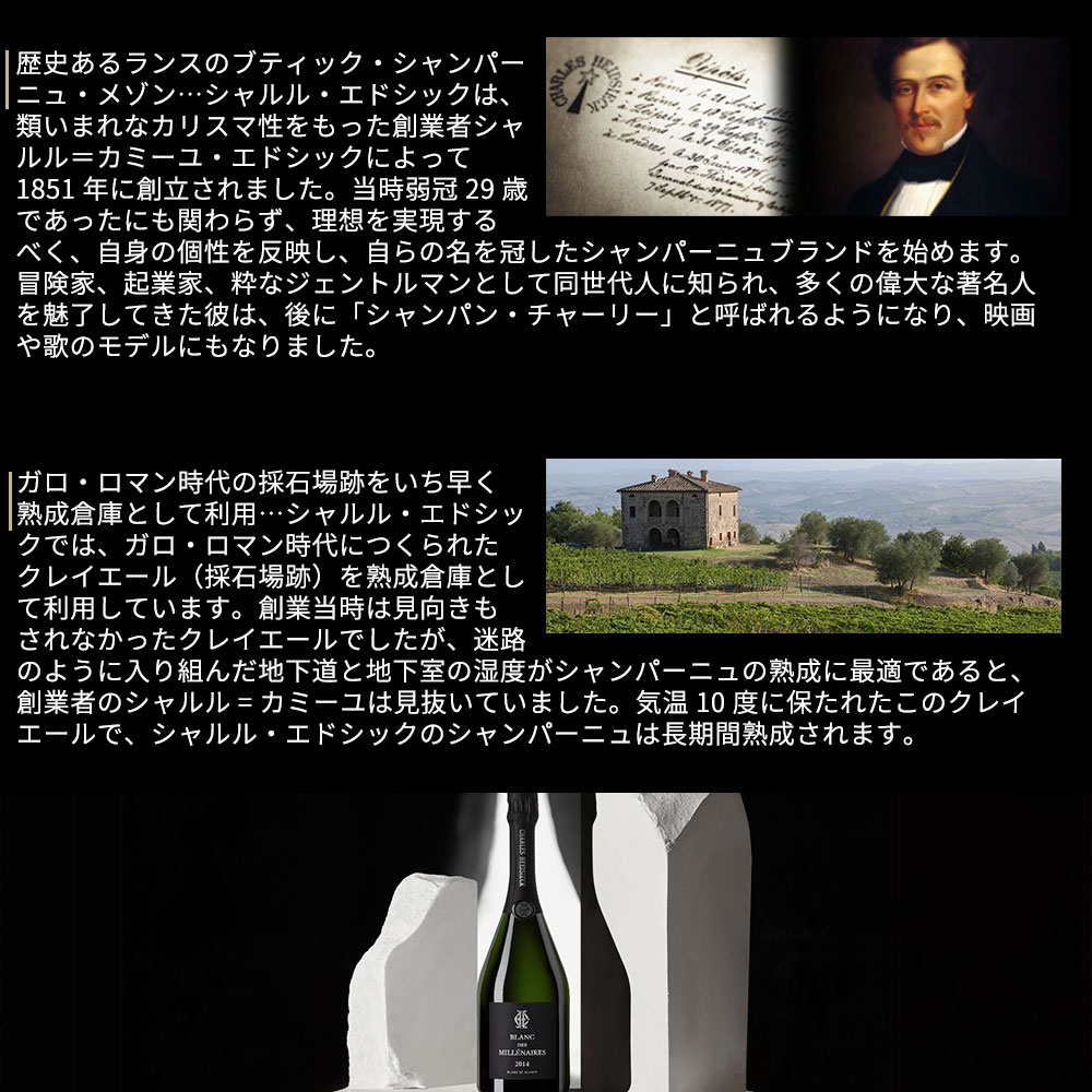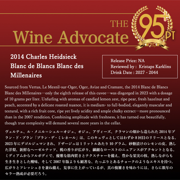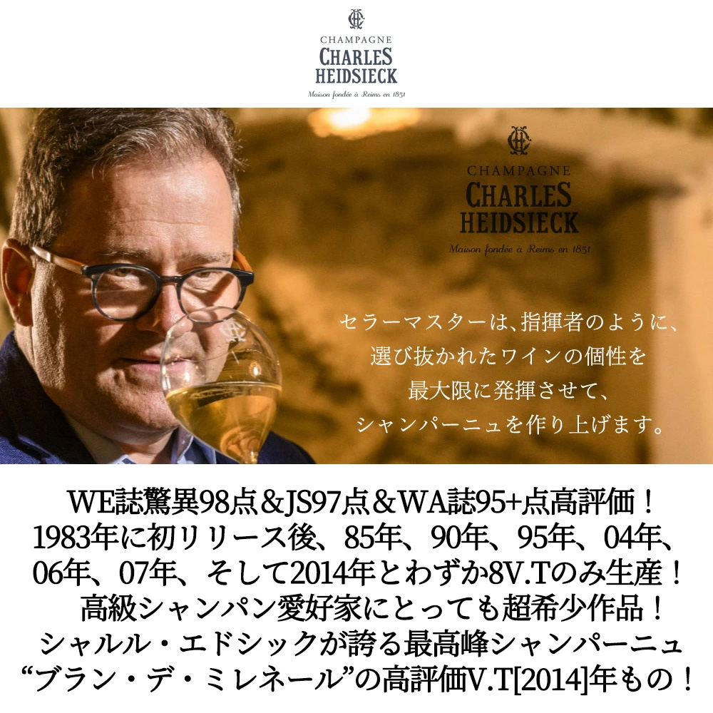 シャルル・エドシックが誇る最高級シャンパーニュ“ブラン・デ・ミレネール”が最新ヴィンテージで高評価スーパーグレイトヴィンテージ[2014]年で限定で少量入荷!