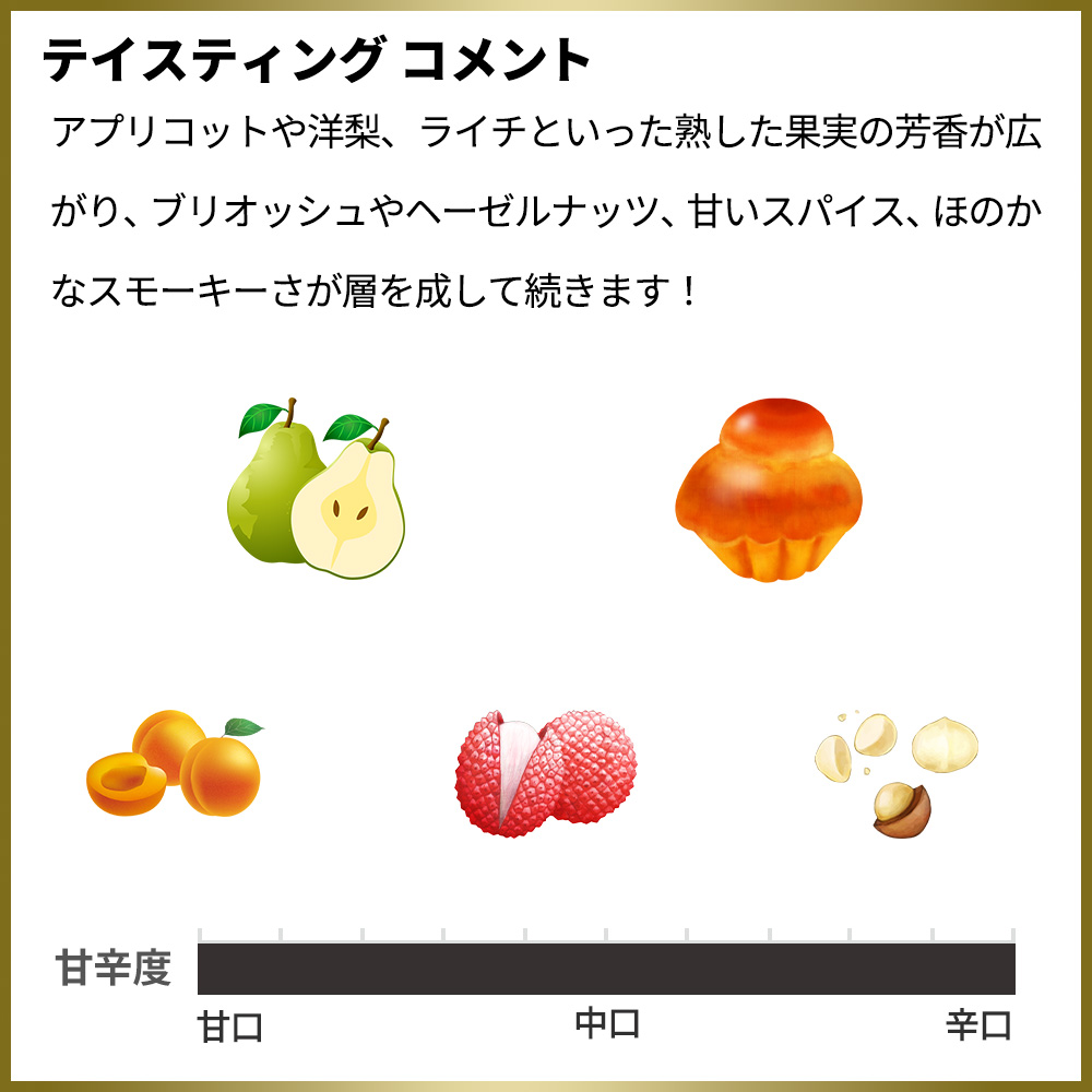 グラスに注ぐとまず、アプリコットや洋梨、ライチといった熟した果実の芳香が広がり、ブリオッシュやヘーゼルナッツ、甘いスパイス、ほのかなスモーキーさが層を成して続きます!アルゴンヌ産オーク樽由来の繊細なウッド香が全体を支え、甘やかさとドライさの絶妙なバランスを生み出しています!口当たりはしなやかで凝縮感がありながらも、アイらしいミネラルと塩味がピンと伸び、温かみのある旨味と透明感のある酸が共存!余韻には樽と果実の香りが長く続き、豊かでありながら洗練された印象を残します!