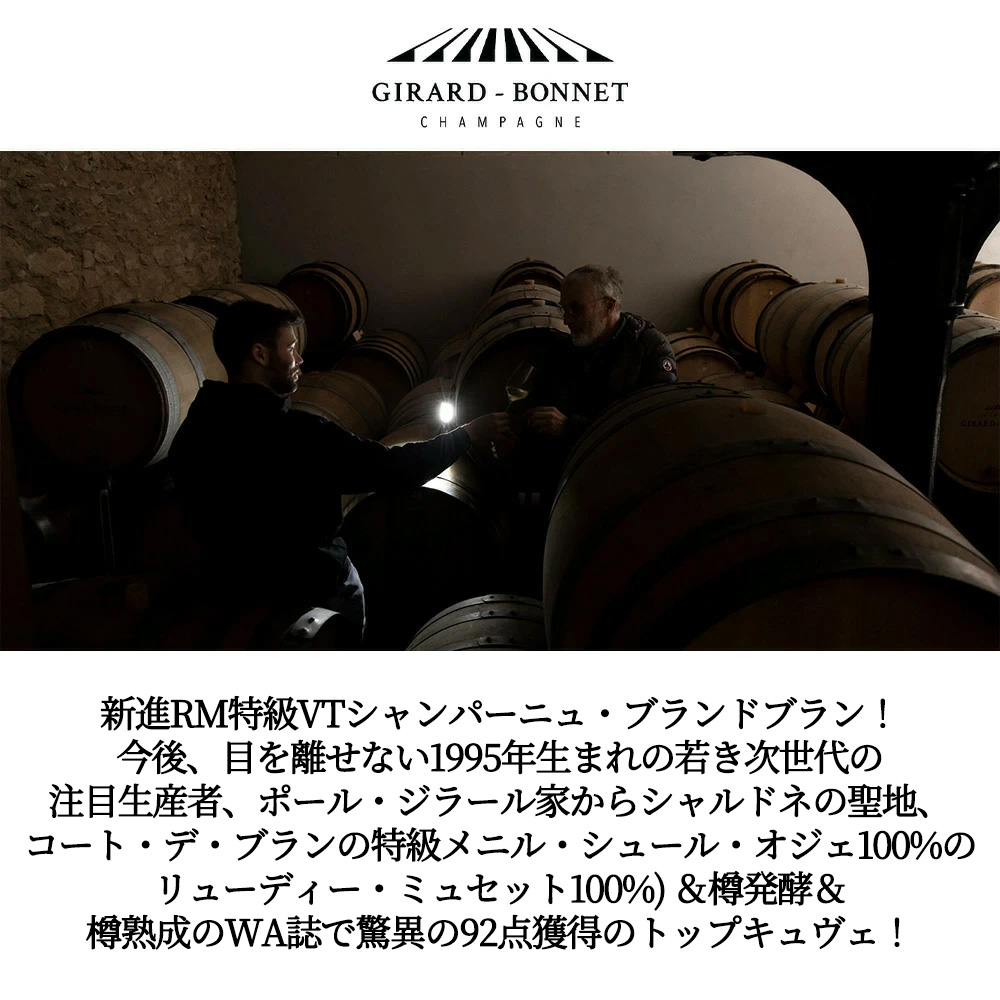 コート・デ・ブラン地区のグラン・クリュ (特級畑) に認定されたシャルドネのみを100%使用のブランドブラン!しかも自然派・オーガニック&ビオディナミ認証!しかもメニルのシャルドネを使用のこだわり。1971年植樹の平均樹齢驚異の55年近くの年ヴィエーユ・ヴィーニュVV&オーク樽発酵&熟成 (澱と共に10ヶ月熟成&瓶熟約51ヶ月以上) で造られるトップキュヴェのひとつ!究極特級・ブランドブラン・VV・エクストラ・ブリュット・シャンパーニュ!ドサージュわずか1g/Lの本格派シャンパーニュ!今後、大注目のR.Mシャンパーニュが遂に日本初登場!ワインアドヴォケイト誌驚異の92点獲得!
