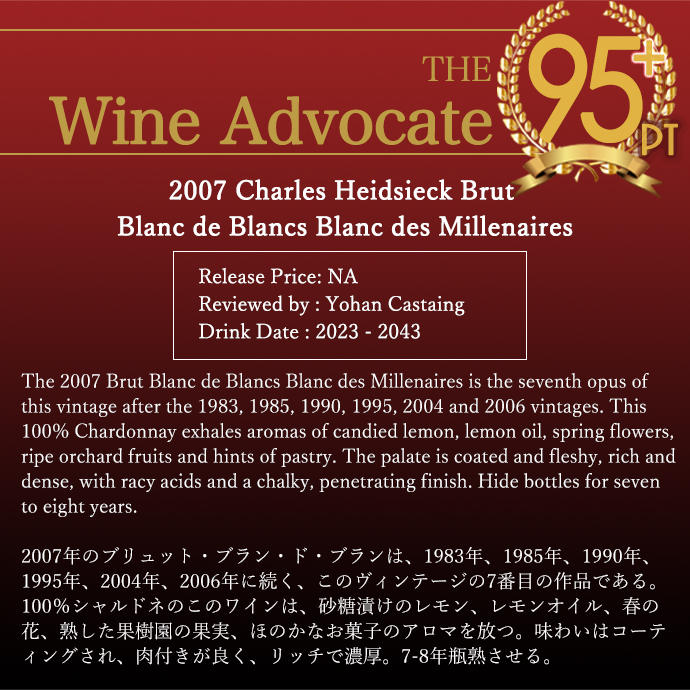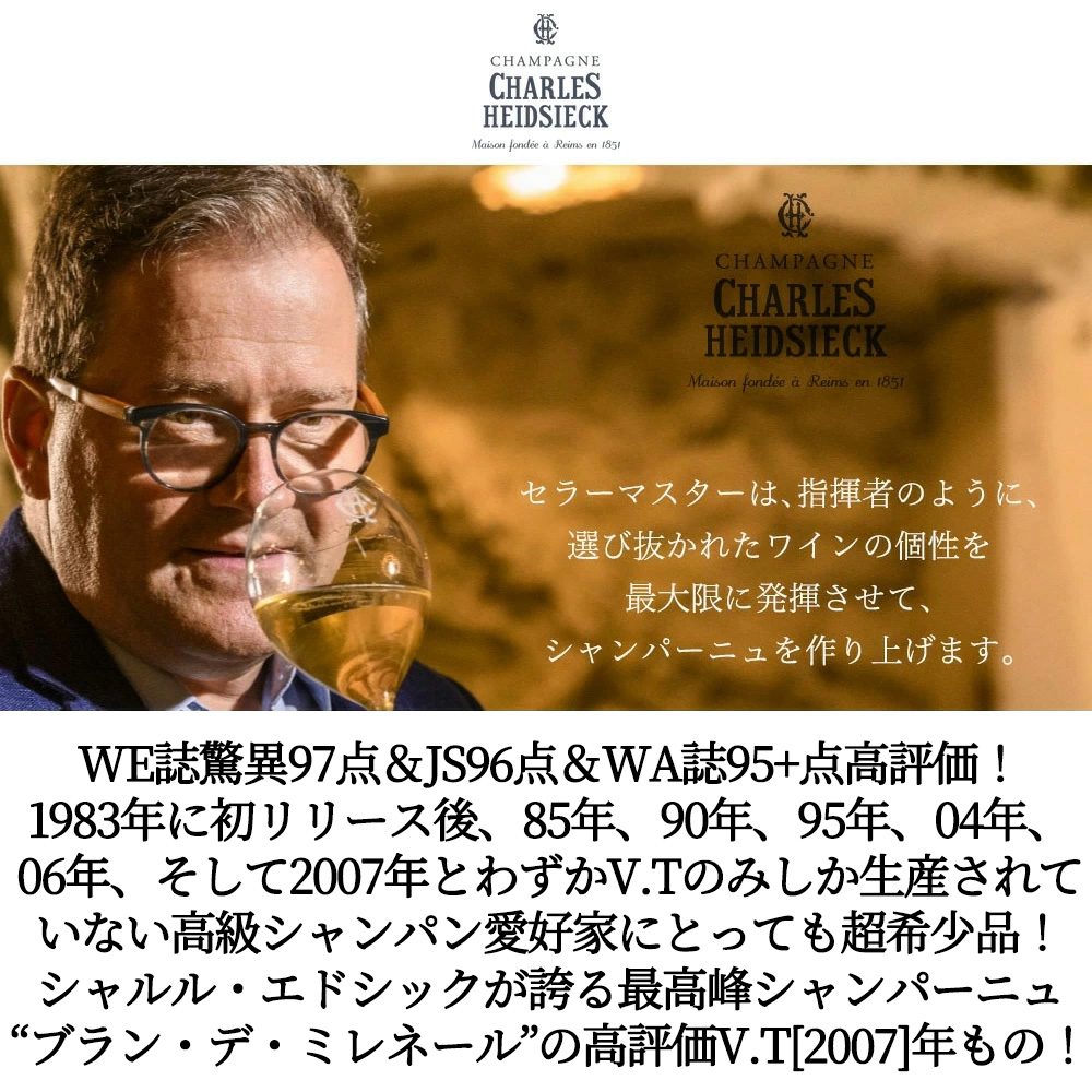 シャルル・エドシックが誇る最高級シャンパーニュ“ブラン・デ・ミレネール”が最新ヴィンテージで高評価[2007]年で豪華箱入で限定で少量入荷!