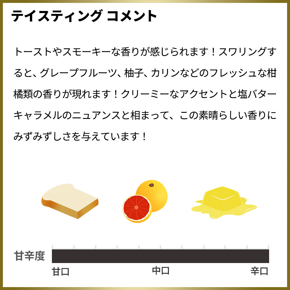 コート・デ・ブランの塩味のあるミネラルが全面に出ており、トーストやスモーキーな香りが感じられます!スワリングすると、グレープフルーツ、柚子、カリンなどのフレッシュな柑橘類の香りが現れます!クリーミーなアクセントと塩バターキャラメルのニュアンスと相まって、この素晴らしい香りにみずみずしさを与えています!