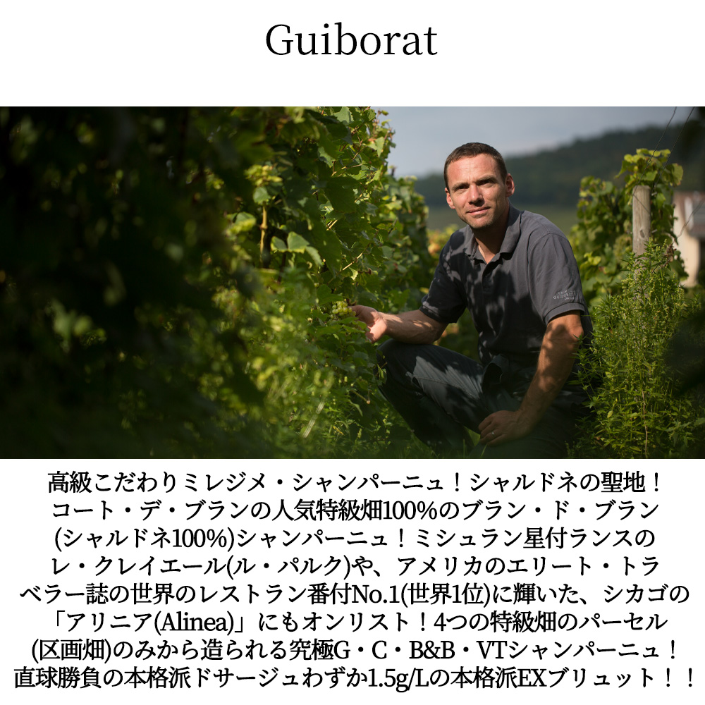ミシュラン星付ランスのレ・クレイエール(ル・パルク)や、アメリカの「エリート・トラベラー」誌の世界のレストラン番付No.1(世界1位)に輝いた、シカゴの「アリニア(Alinea)」にもオンリスト!しかもシャルドネの聖地!コート・デ・ブランの、しかもグラン・クリュ特級100%!しかもクラマン特級・グラン・クリュの限定畑、珍しいシュイイ特級、さらにオワリー・グラン・クリュ特級の限定畑の、しかも4つのパーセル(区画畑)のみ100%から造られる究極グラン・クリュ・ブラン・ド・ブラン・シャンパーニュ!しかも直球勝負の本格派ドサージュわずか1.5g/Lの本格派エクストラブリュット!!
