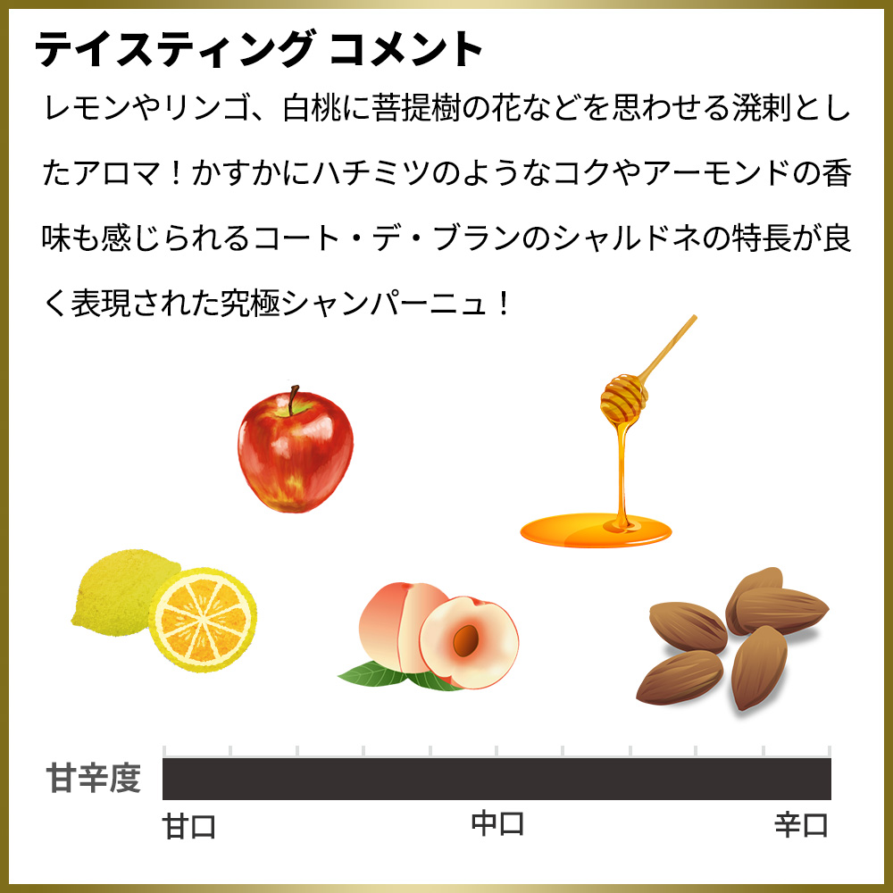 ずばり、クラマンやシュイイ、オワリといった珠玉のグラン・クリュのシャルドネ100%を上手に使い、愛好家がシャンパンに求めるミネラル感そのもの!が存在するシャンパーニュに仕上げられた究極ブラン・ド・ブラン・シャンパーニュ!!しかもスーパーグレイトヴィンテージの単一年産100%のミレジム・シャンパーニュ!(WAでシャンパーニュに94点)(Outstanding. Still tannic, youthful or slow to mature)!