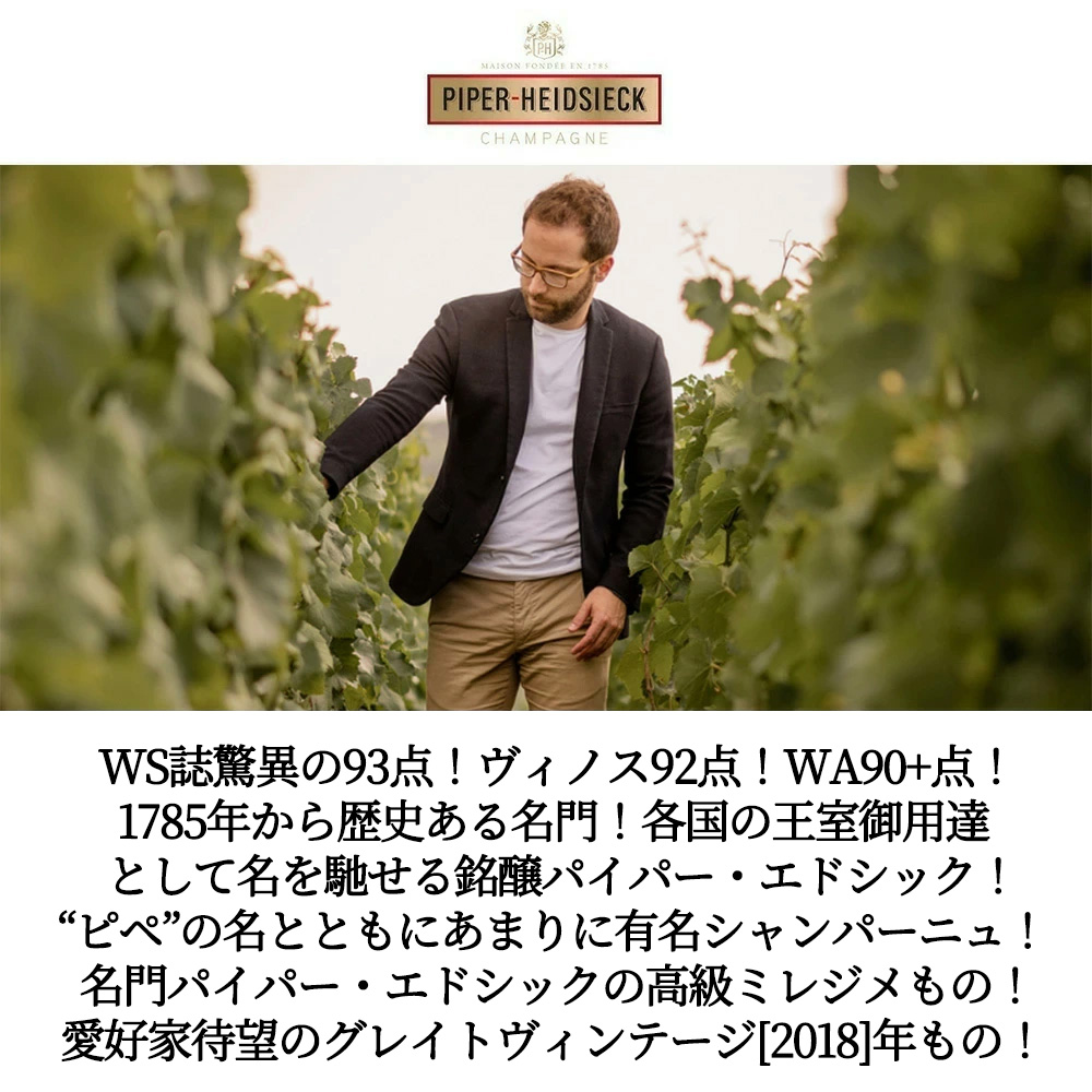 2018年のパイパー・エドシックは手摘み100%に、非常に調和のとれたブレンド比率!17クリュから厳選したピノ・ノワール50%にシャルドネ47%、ピノ・ムニエ3%の黄金比率による構成!しかも最低7年のセラーによる瓶内熟成されたこのワインからは、洗練されたバランスの良いアロマが感じられます!