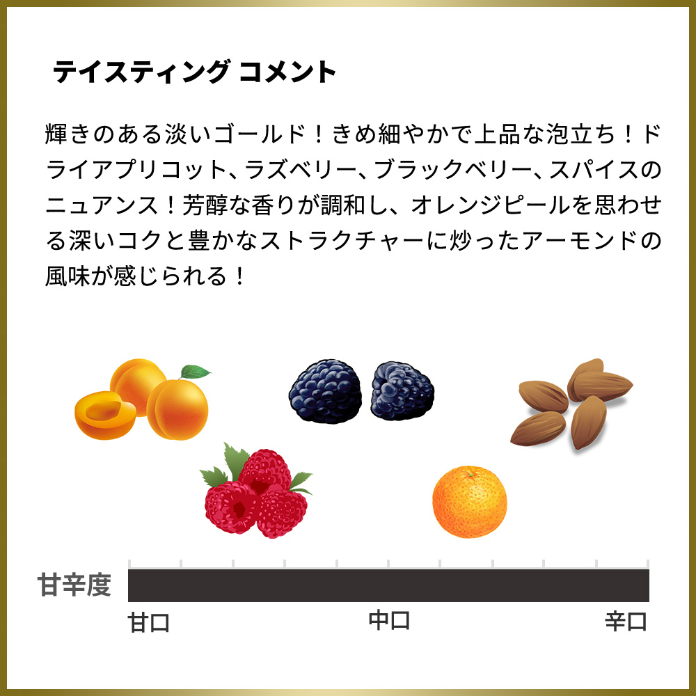 輝きのある淡いゴールド!きめ細やかで上品な泡立ち!ドライアプリコット、ラズベリー、ブラックベリー、スパイスのニュアンス!芳醇な香りが調和し、オレンジピールを思わせる深いコクと豊かなストラクチャーに炒ったアーモンドの風味が感じられる究極ミレジムシャンパーニュが限定で正規品の素晴らしい状態で限定少量入荷!
