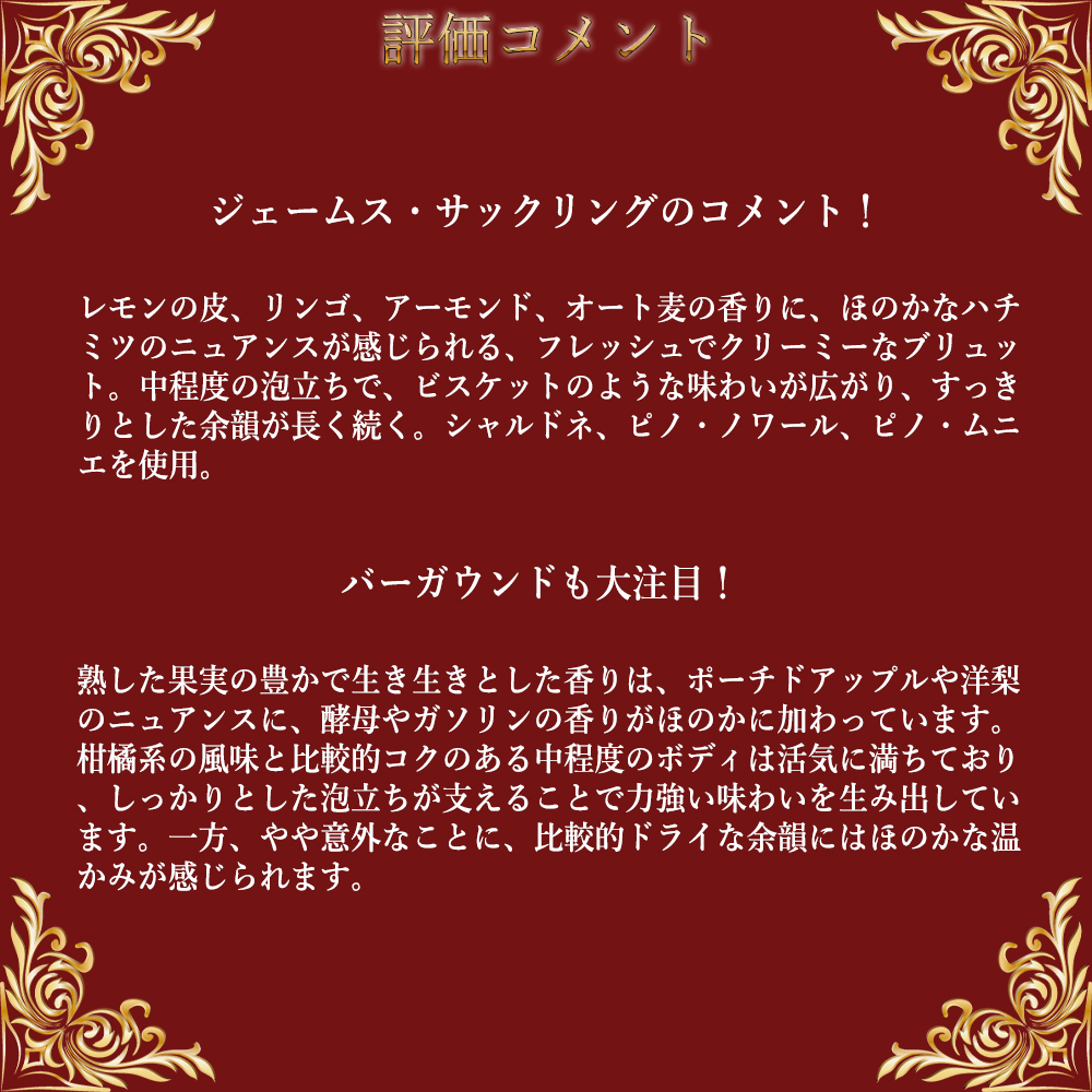 ■ぶどう品種:ピノ・ノワール40%、シャルドネ40%、ピノムニエ20%