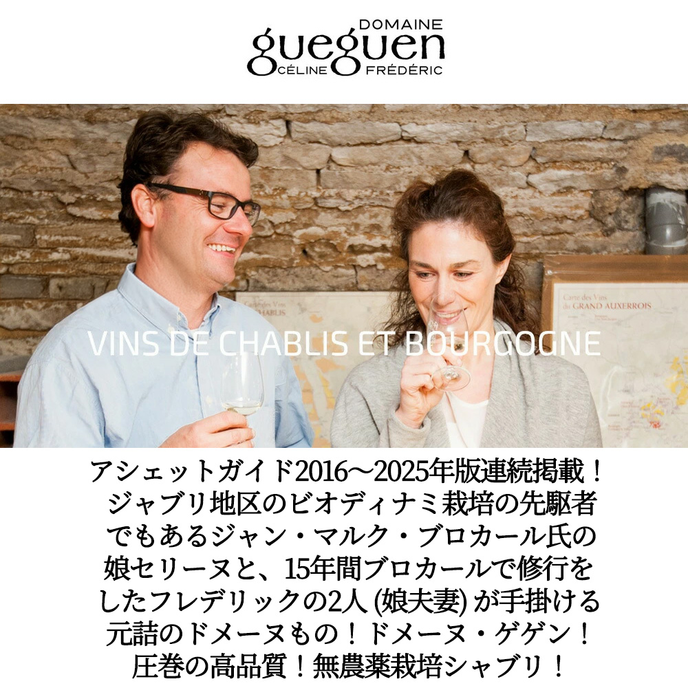ジャブリ地区のビオディナミ栽培の先駆者でもあるジャン・マルク・ブロカール氏の娘セリーヌ・ブロカールと、15年間ブロカールで修行をつんだフレデリックの2人 (娘夫妻) が手掛ける元詰のドメーヌものの無農薬栽培シャブリ!