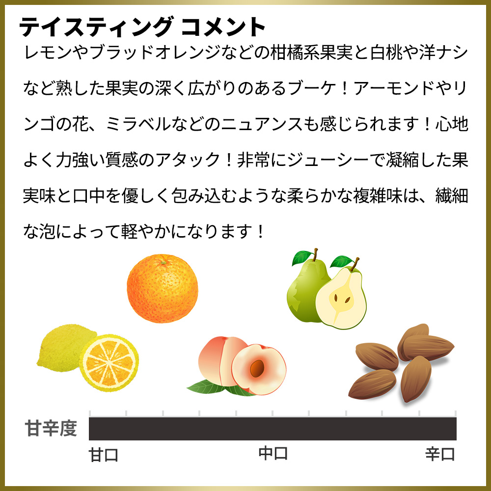 外観は黄金色の美しい色調!凝縮した非常にきめ細かい泡が泡立ちます!レモンやブラッドオレンジなどの柑橘系果実と白桃や洋ナシなど熟した果実の深く広がりのあるブーケ!アーモンドやリンゴの花、ミラベルなどのニュアンスも感じられます!心地よく力強い質感のアタック!非常にジューシーで凝縮した果実味と口中を優しく包み込むような柔らかな複雑味は、繊細な泡によって軽やかになります!