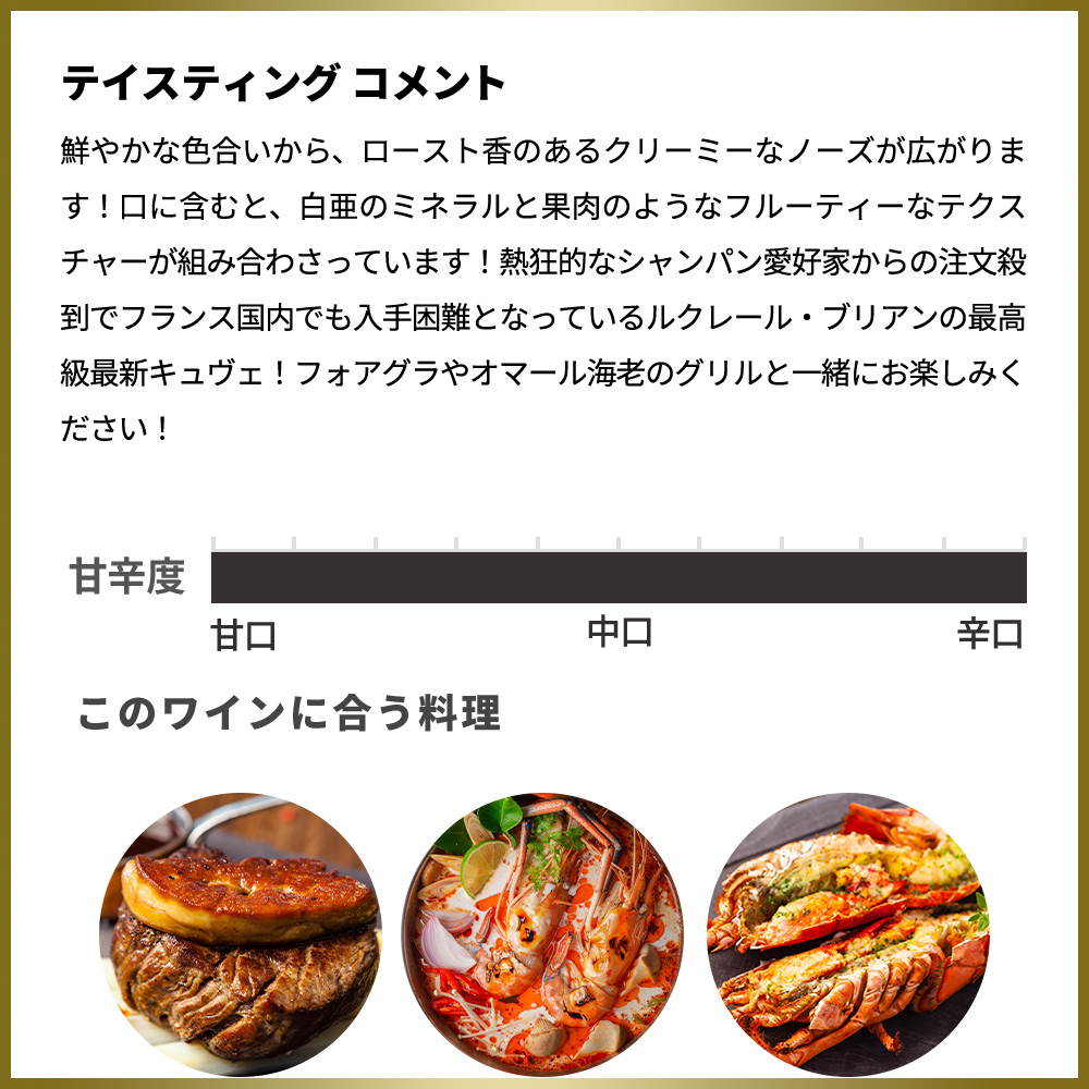 鮮やかな色合いから、ロースト香のあるクリーミーなノーズが広がります!口に含むと、白亜のミネラルと果肉のようなフルーティーなテクスチャーが組み合わさっています!熱狂的なシャンパン愛好家からの注文殺到でフランス国内でも入手困難となっているルクレール・ブリアンの最高級最新キュヴェ!フォアグラやオマール海老のグリルと一緒にお楽しみください!