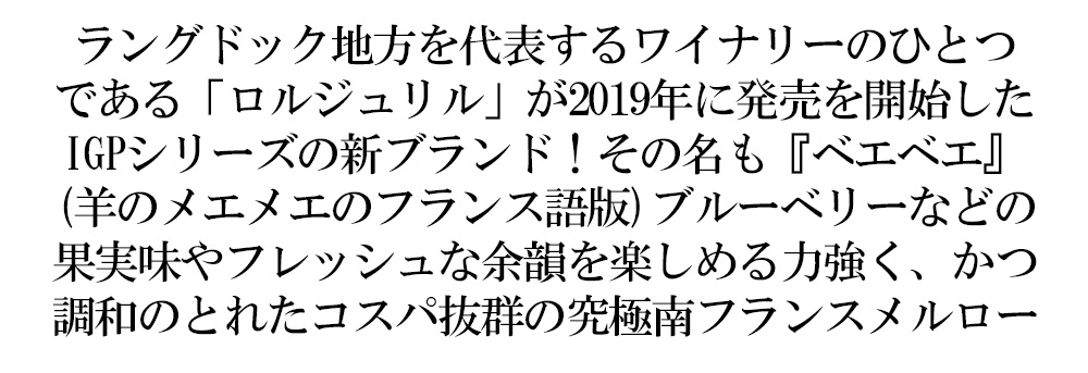 ベエ・ベエ・メルロー[2021]年 その名も『ベエベエ』(メエメエのフランス語版)は、ラングドック地方を代表するワイナリーのひとつである「ロルジュリル」が2019年に発売を開始した、IGPシリーズの新ブランド! かわいいヒツジのラベル!しかもラベルデザインはピンクのラベルでケースの中に6つのパターン(6種類)があります。 このベエ・ベエ・メルローは ノワール山脈麓の海抜450mの高標高畑からの粘土石灰質土壌の 畑の樹齢25~30年のメルローをコンクリート製タンクで醸造された ブルーベリーなどの果実味やフレッシュな余韻を楽しめる力強く、 かつ調和のとれたコスパ抜群の辛口赤ワイン! 食卓に、驚きを。括目のコストパフォーマンスです!