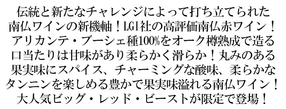 ビッグ レッド ビースト 2023年 IGPペイ ドック ■葡萄品種:アリカンテ・ブーシェ種 100% 3年連続金賞受賞酒! 「ラングドック地方のテロワールを十分に活かす」という確固たる信念のもと、日々変化していくニーズに耳を傾ける。近代的製法を取り入れながら高品質で果実味あふれるラングドックの魅力を発信すべく邁進する造り手。 美しく輝く紫色を帯びた黒色の強いガーネット。熟したブルーベリー、プラムなど黒系果実の豊かな香りに、ラズベリーなど赤系果実のアロマも感じる。明確なスパイスの香りにスミレ、ミネラルと、時間と共に黒系果実のジャム、黒砂糖、バニラ、スモーキーで芳醇な香りが広がり複雑。口当りは甘味があり柔らかく滑らか。丸みのある果実味にスパイス、チャーミングな酸味、柔らかなタンニンを楽しめる豊かで果実味溢れる辛口赤ワインです。