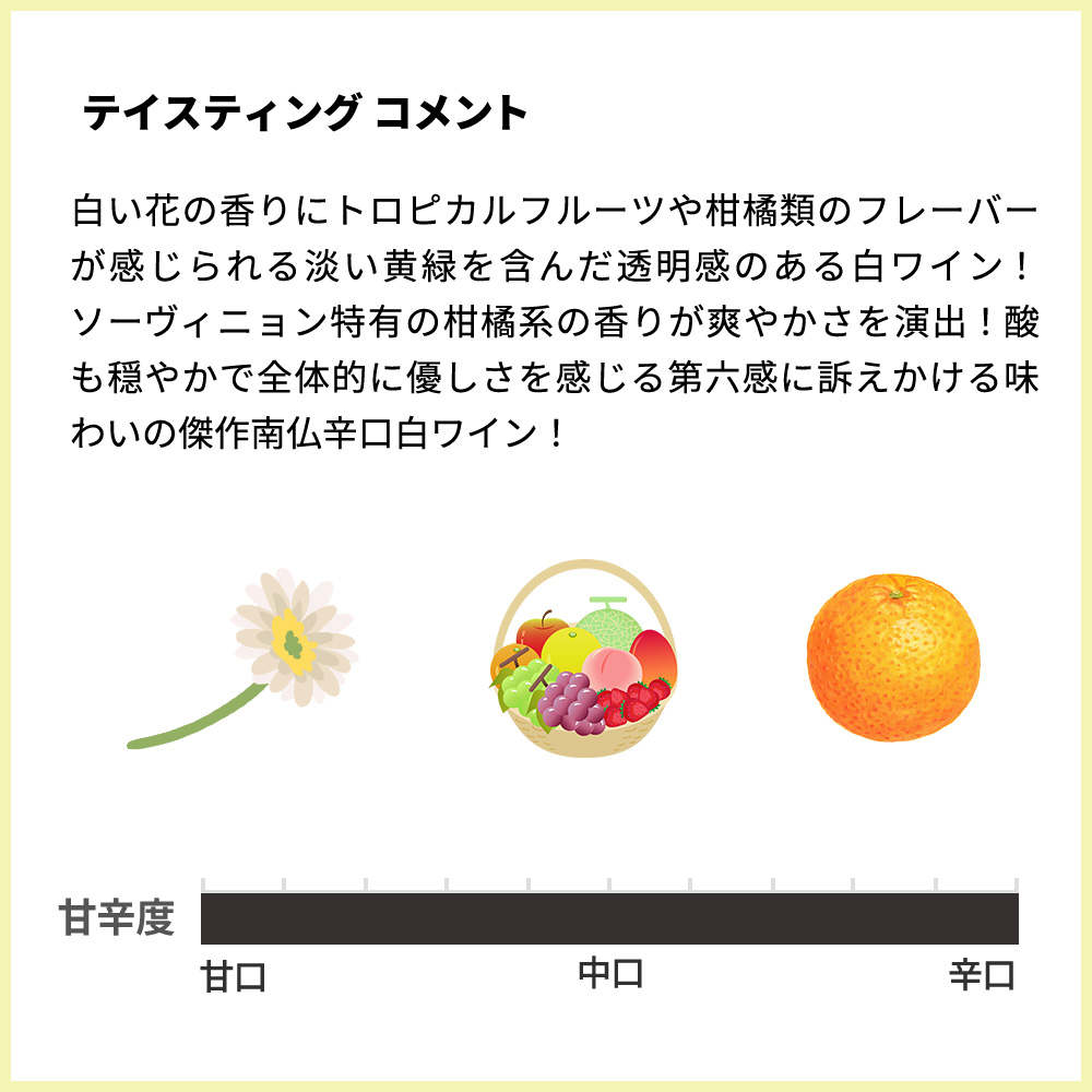 ソーヴィニョン特有の柑橘系の香りが爽やかさを演出!酸も穏やかで全体的に優しさを感じる第六感に訴えかける味わいの傑作南仏辛口白ワイン!きりっと冷やして頂く夏向きのワイン“大人気シジエム・サンス・ブラン”!