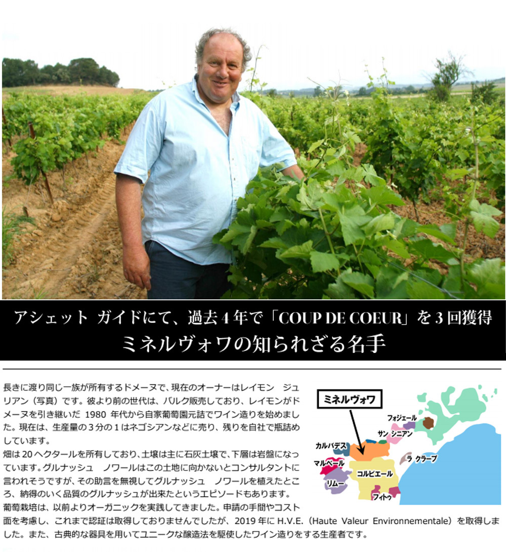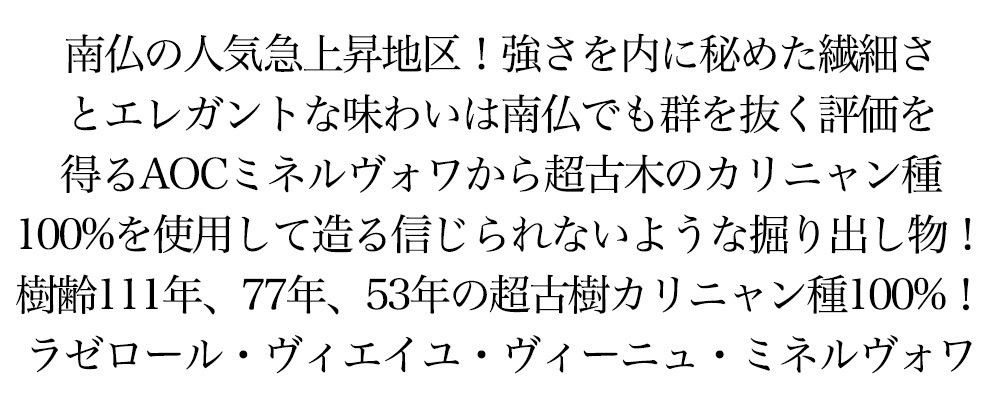 ラゼロール・ヴィエイユ・ヴィーニュ・ミネルヴォワ[2021]年・レイモン・ジュリアン ■樹齢:古いものは1910年植樹の112年もの、その他1944年植樹の78年もの、1968年植樹の54年ものの三つの区画の古木 ■葡萄品種:カリニャン種100% ■収穫量:25hL/ha ■マセラシオン:約2週間 ■熟成:14ヶ月 南フランスの人気急上昇地区から、信じられないような超古木のカリニャン種100%のみを使用して造られる掘り出し物! ヒュー・ジョンソン氏はAOCミネルヴォワについて「丘陵にあるAOC地区。生き生きとした良質のワインを産する」と述べ★★(ダブルスター)高評価!ずばり年間300日以上晴天が続くという南フランスならではの完熟カリニャン種で造られる究極辛口フルボディ赤ワイン。 透けて通らないくらい濃厚な色合い素晴しい凝縮感とやわらかな果実味、見たこともないような伝統的な手法を使うミネルヴォワの生産者!