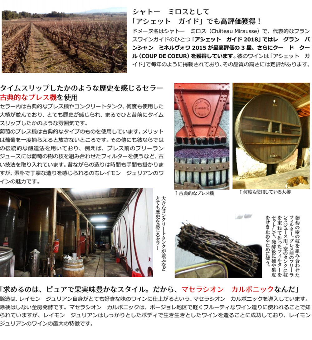 「古典的な手法や独自の醸造法を駆使」 現在ではあまり使用されない古典的な手法や、レイモンならではの独特の醸造法を用いてワイン造りをしています。葡萄のプレス機は1936年産の古典的なものを使用しています。メリットは葡萄を一度捕らえると放さないところで、シャトー マルゴー、有名なシャンパーニュの生産者など、著名な生産者はこのプレス機に戻っています。
