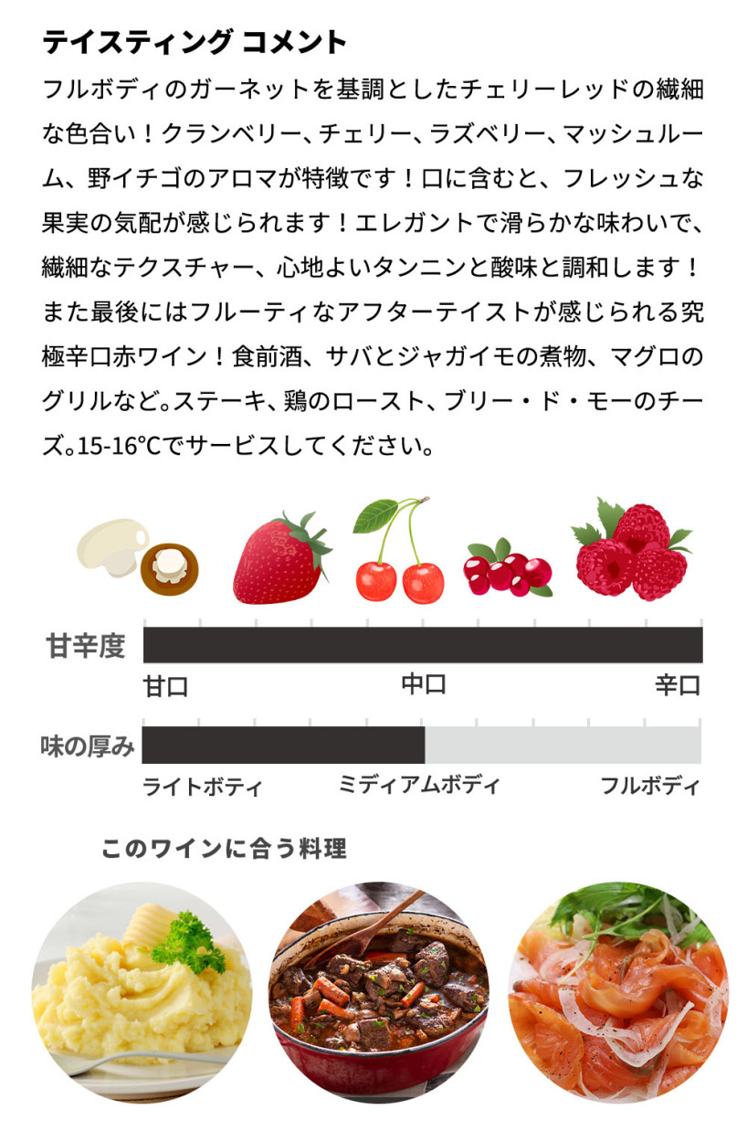 ル・ヴェルサン・ピノ・ノワール[2023]年・ヴィノーブル・フォンカリユ元詰・IGPペイドック・重厚ボトル・6ヶ月熟成・正規品 ■ぶどう品種:ピノ・ノワール100% ブドウ果汁はアロマの輝きを保つため、発酵前に5~6日間冷やされ(低温マセラシオン)濃厚な果実を抽出します!ワインのアルコール発酵とマロラクティック発酵は、温度管理されたステンレス製のタンクで行われ、2週間のマセラシオンと1日2回の短いポンピングで、より穏やかな抽出が可能です! ワインはさらに6ヶ月間熟成させ完成します!葡萄品種とテロワールの完璧なマッチング!ヴェルサンの特長であるバランスとエレガンス! フルボディのガーネットを基調としたチェリーレッドの繊細な色合い! クランベリー、チェリー、ラズベリー、マッシュルーム、野イチゴのアロマが特徴です! 口に含むと、フレッシュな果実の気配が感じられます!エレガントで滑らかな味わいで、繊細なテクスチャー、心地よいタンニンと酸味と調和します! また最後にはフルーティなアフターテイストが感じられる究極辛口赤ワイン! 食前酒、サバとジャガイモの煮物、マグロのグリルなど。ステーキ、鶏のロースト、ブリー・ド・モーのチーズ。15-16℃でサービスしてください。