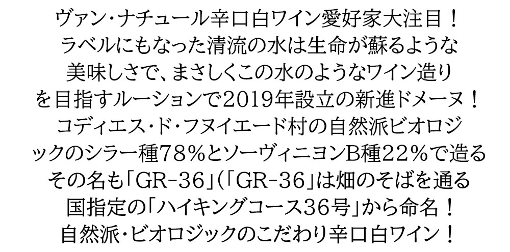 GR-36 ブラン プリュム 2023 ドメーヌ ブラン プリュム元詰 ■ぶどう品種:シラー72%、ソーヴィニヨンブラン28% ■発酵・熟成:ステンレスタンクで発酵後、8ヶ月間熟成 ■平均樹齢:20年 ■土壌:粘土石灰質、泥土質、砂質土壌 フランス・ルーション地方で2019年設立の新進ドメーヌからコディエス・ド・フヌイエード村の自然派・ビオロジックのシラー種78%とソーヴィニヨン・ブラン種22%を驚異の低収量の32hl/haで収穫! ステンレスタンク醗酵&8ヶ月熟成(無清澄、ノンフィルター)で造られる自然派・ビオロジックの辛口白ワイン!その名も「GR-36」! 無清澄、ノンフィルターでビン詰め!SO2は不使用!「GR-36」は畑のそばを通る国指定の「ハイキングコース36号」のことで、ラベルの写真はペルピニャン在住の高名な写真家Saint.Eが撮影した、道中の清流です! まさに超こだわりのヴァン・ナチュール(「Vin Methode Nature」)!自然派・ビオロジック愛好家垂涎の辛口白ワインが限定で現地のセラー数ヶ月前の蔵出し品で少量入荷!