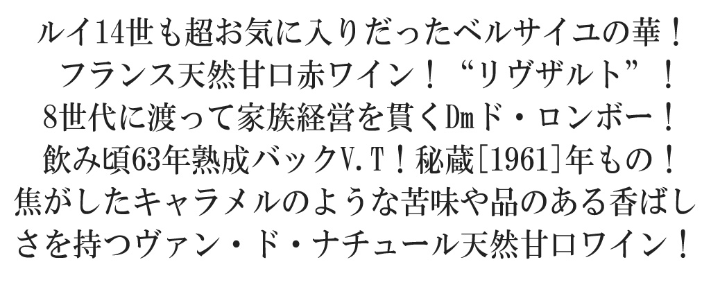 超希少!入手困難!フランス天然甘口(ヴァン・ド・ナチュール)赤ワイン愛好家大注目!オールドヴィンテージ天然甘口ワイン愛好家大注目!デザートワイン愛好家大注目!ヴァン・ド・ナチュール(天然甘口ワイン)ファン大注目!ルイ14世も超お気に入りだったと言うベルサイユの華!の飲み頃63年熟成バックヴィンテージ!超希少限定古酒!しかも元詰蔵出し品!造り手は、ラングドック・ルーションのまさにリヴザルト本拠地のドメーヌ・ド・ロンボーによる元詰蔵出しリヴザルトAOC!Domaine de Rombeauの創設は、1850年までさかのぼります(8世代に渡って家族経営・8代目当主ピエール=アンリ・ド・ラ・ファブレグ家元詰蔵出し品)!地域ではこの分野のパイオニアとされ8世代に渡る栽培努力を実らせました!畑はリヴザルトのヴァレ・ド・ラグリに沿って広がっているため、優れた気候特性の恵みを受け、葡萄栽培や優れた品質の葡萄の成熟に理想的です!1850年以来、ドメーヌ・ロンボーを運営するワイン生産者たちは、利用可能な最新のテクノロジーと畑での実験を組み合わせて、ワインを開発してきました!アグリィ平野に位置するドメーヌ・ドゥ・ロンボーの畑は、例外的な土壌と気候条件の恩恵を受けています!小石を多く含む粘土石灰質の土壌は、ブドウの発育に特に適しています!また、水位が浅いため、ブドウに必要な水をすべて確保することができます!さらに、この地域を定期的に通過する海風とトラモンターニュが、ブドウの木を健康に保つのに役立っている!ローマ時代にすでにこの土地でブドウ栽培が行われていたことは、偶然ではありません!現在、100ヘクタールのブドウ畑では、典型的な地場品種と、完璧に順応した他地域の品種が栽培されています!ドメーヌの中には、樹齢65年のグルナッシュや25年以上のシラーなど、この地域で最も古いブドウの木もあります。)彼らにより大切に保管されてきた非常に希少な秘蔵古酒!ずばり今!爆発人気!ラングドック・ルーションの甘口の雄!年々、プレゼント用として同じくらい需要が高まっている「自分用」「バースデーヴィンテージ」のプレミアム・スイーツワイン!ルイ14世も超お気に入りだったと言うベルサイユの華!リヴザルトAOCの希少限定古酒!しかもロウ封印キャップ&ロットナンバー入り&豪華木箱入りの63年熟成の記念ボトル!63周年記念のお祝いに!昭和36年生まれの方へのバースデープレゼントに最適です!