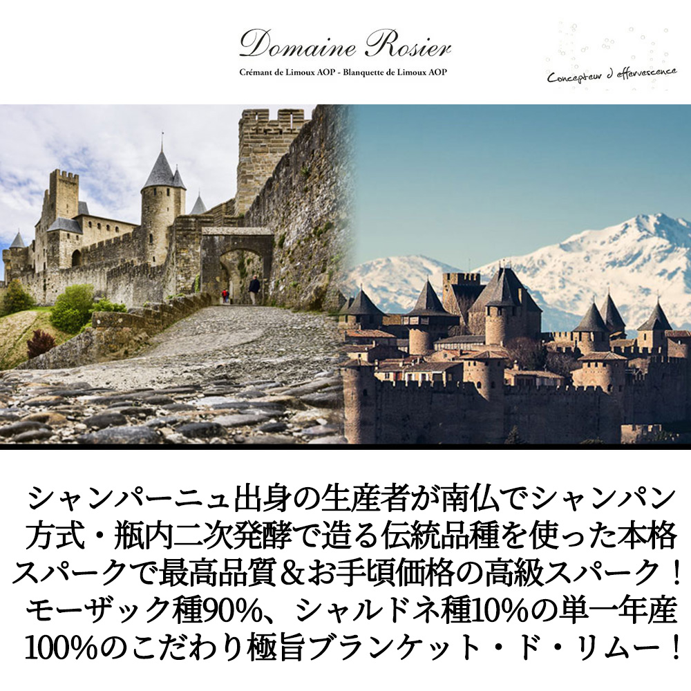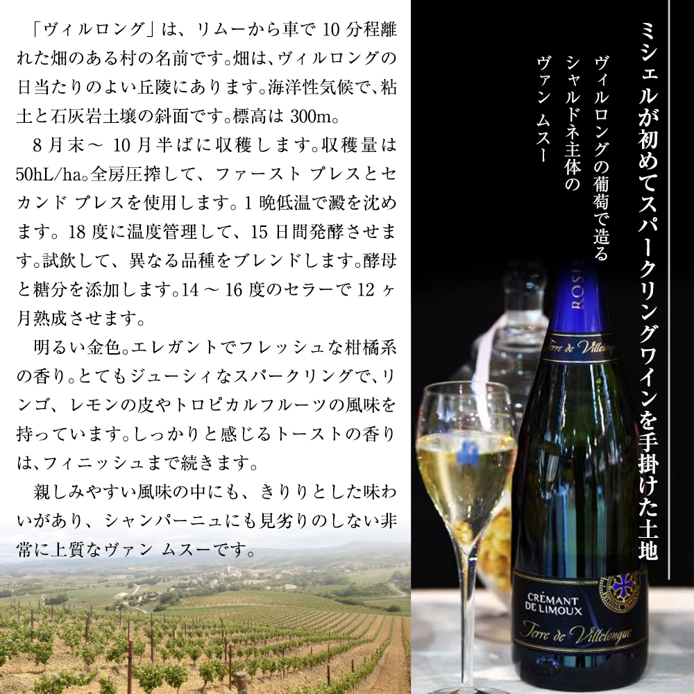 造り手はフランスのワイン評価誌「アシェット・ガイド」で毎年のように掲載され、リムーの名手として知られる有力生産者ドメーヌ・ロジェの手による当主ミシェルが初めてスパークリングワインを手掛けた土地ヴィルロングの葡萄100%で造る