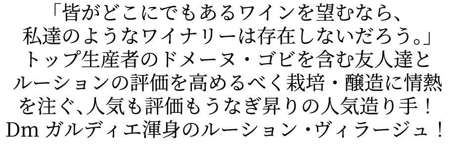 「品種の特徴を生かすように醸造」 ソーヴィニヨンやヴィオニエ等のアロマティックな品種は酸化を好まないので、酸化をコントロールし、果実味が出たワインとして造ります。マカベオなど元々香りがあまり出ない品種は、酸化させることで香りが出るので、樽で熟成させます。 評価 「ワインスペクテーター」ではルションの新しい生産者の一人として紹介。また、アンドリュ ジェフォード「ザ ニュー フランス」にも、ゴビと共に2ッ星で掲載されています。