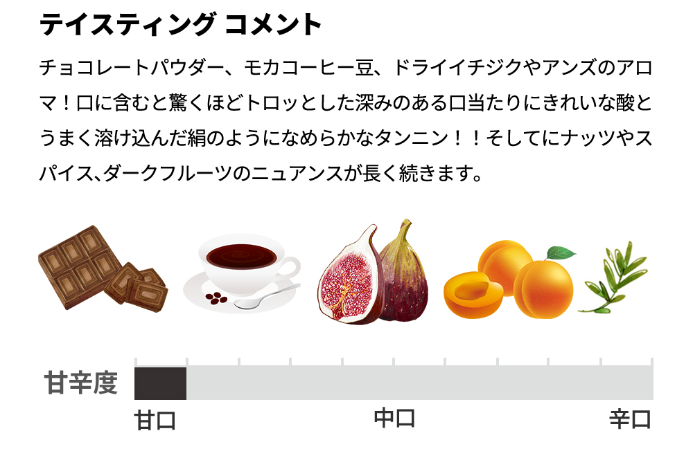 口に含むと驚くほどトロッとした深みのある口当たりにきれいな酸とうまく溶け込んだ絹のようになめらかなタンニン!!そしてにナッツやスパイス、ダークフルーツのニュアンスが長く続きます。まさにヴィンテージ・ボートの世界とも通じる優雅な味わい!!