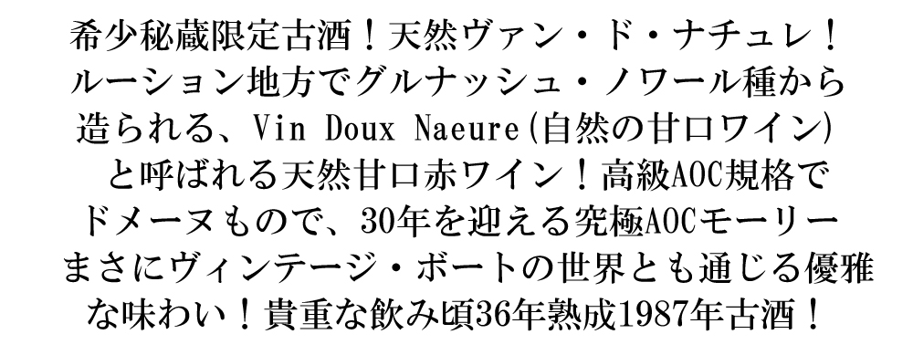 AOCモーリーと言えば、ルーション地方でグルナッシュ・ノワール種から造られる、Vin Doux Naeure(自然の甘口ワイン)と呼ばれる天然甘口赤ワイン!!しかも貴重な飲み頃!36年熟成!