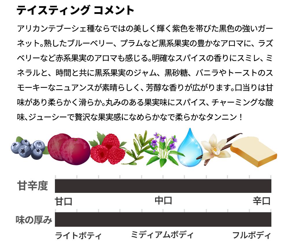 明確なスパイスの香りにスミレ、ミネラルと、時間と共に黒系果実のジャム、黒砂糖、バニラやトーストのスモーキーなニュアンスが素晴らしく、芳醇な香りが広がります。口当りは甘味があり柔らかく滑らか。