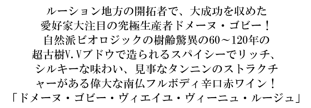 ルーション地方の開拓者であり大成功を収めた究極生産者ドメーヌ・ゴビーによる自然派・ビオロジック(ユーロリーフ認証)で造られるスパイシーでリッチ、シルキーな味わいで、見事なタンニンのストラクチャーがある偉大なフルボディ辛口赤ワイン!