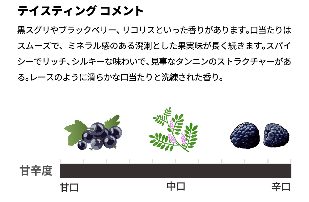 黒スグリやブラックベリー、リコリスといった香りがあります。口当たりはスムーズで、ミネラル感のある溌溂とした果実味が長く続きます。スパイシーでリッチ、シルキーな味わいで、見事なタンニンのストラクチャーがある。レースのように滑らかな口当たりと洗練された香り。混じりけのない果実味が長く残り、数年熟成させることでまた違う表情を見せます。