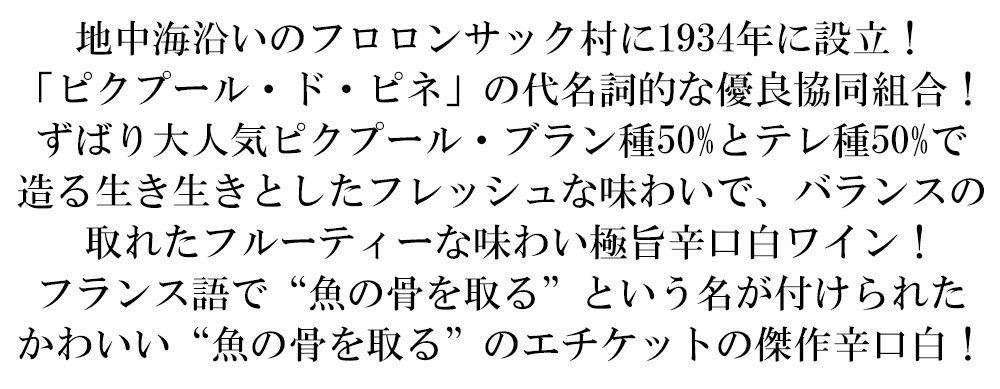 海岸沿いのリゾート地で大人気のピクプール・ブラン種50%とテレ種50%で造られる辛口白ワイン!