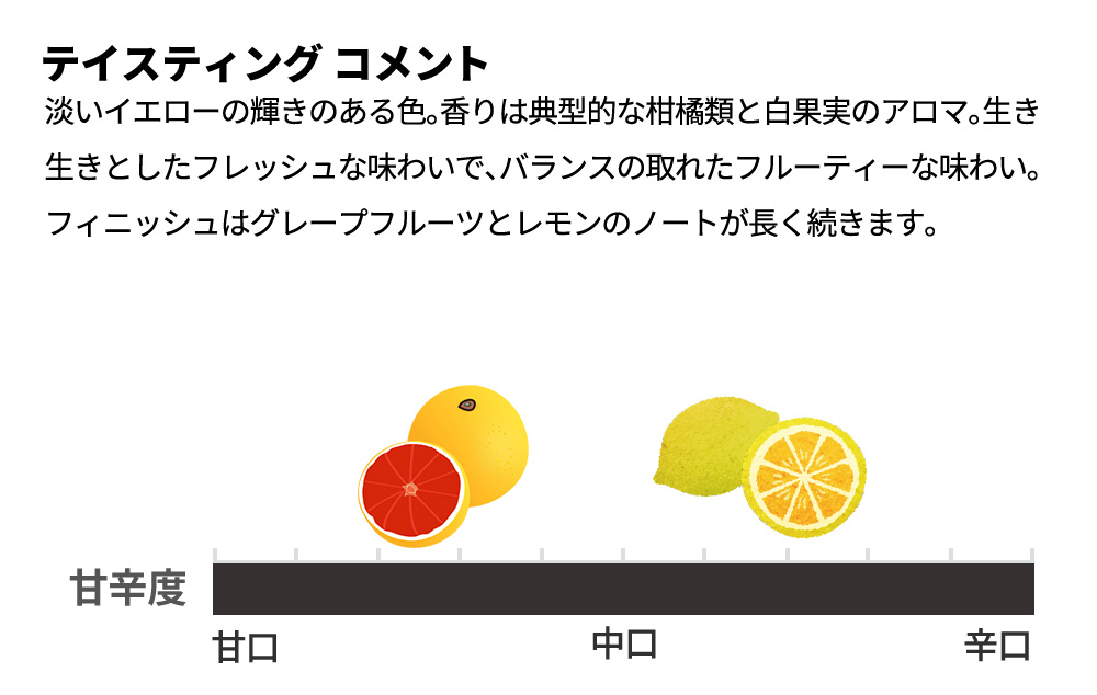 淡いイエローの輝きのある色。香りは典型的な柑橘類と白果実のアロマ。生き生きとしたフレッシュな味わいで、バランスの取れたフルーティーな味わい。フィニッシュはグレープフルーツとレモンのノートが長く続きます。
