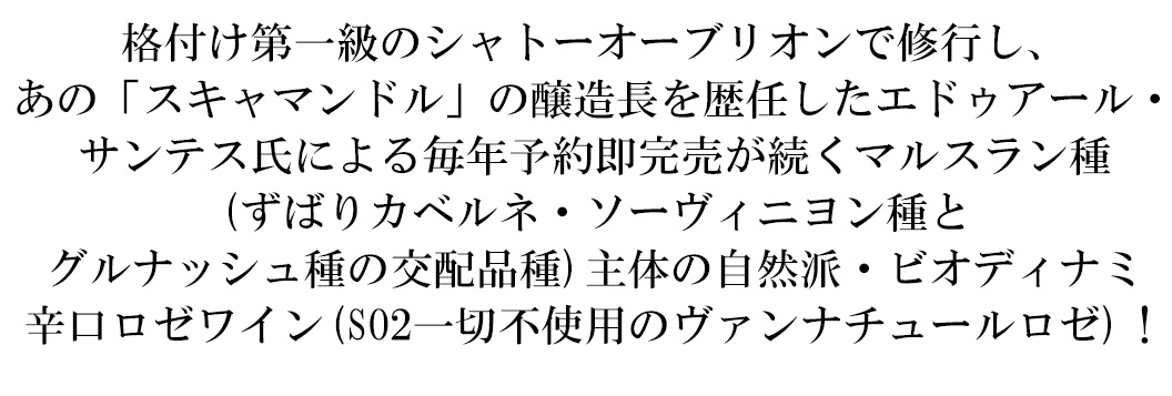 毎年予約即完売が続く自然派マルスラン種(ずばりカベルネ・ソーヴィニヨン種とグルナッシュ種の交配品種で、非常に小粒で2つの葡萄の特徴を持った凝縮感のあるブドウ品種として有名なマルスラン種)主体の辛口ロゼワイン!しかもセニエ法によるロゼワイン!