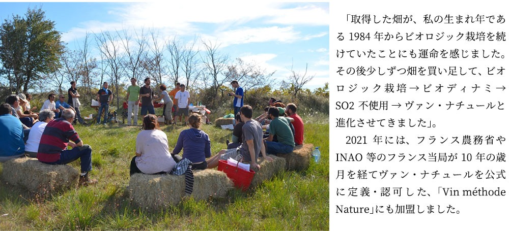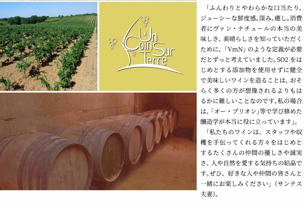 ジューシーな鮮度感。深み。癒し。消費者にヴァン・ナチュールの本当の美味しさ、素晴らしさを知っていただくために、「VmN」のような定義が必要だとずっと考えていました。SO2をはじめとする添加物を使用せずに健全で美味しいワインを造ることは、おそらく多くの方が想像されるよりもはるかに難しいことなのです。私の場合は、「オー・ブリオン」等で学び修めた醸造学が本当に役に立っています」。「私たちのワインは、スタッフや収穫を手伝ってくれる方々をはじめとするたくさんの仲間の優しさや誠実さ、人や自然を愛する気持ちの結晶です。ぜひ、好きな人や仲間の皆さんと一緒にお楽しみください」(サンテス夫妻)。』