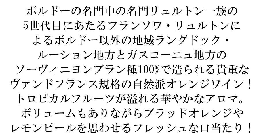 あのボルドーの名門中の名門リュルトン一族の5世代目にあたるフランソワ・リュルトンによるボルドー以外の地域ラングドック・ルーション地方とガスコーニュ地方のソーヴィニヨンブラン種100%で造られる貴重なヴァンドフランス規格の自然派オレンジワイン!