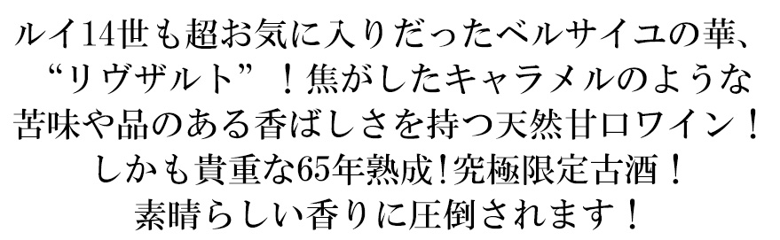 リヴザルト 1960 究極限定秘蔵熟成品 リヴェイラック元詰 AOCリヴザルト ワインアドヴォケイト誌驚異の96点獲得 65年周年記念用ワイン 商品名欄に記載されているドメーヌやシャトーの名前は、もともとその古酒を造り、貯蔵していた生産者名です(今は存在しないところも多いです)。これらの古酒は1999年から今日にかけてビン詰めされ、リヴザルト村にある定温倉庫で保管されています。彼のセレクションは、なんと「eRobertParker.com」や「JancisRobinson.com」でも紹介され、イギリス、ドイツ、オランダ、ノルウェー、スウェーデン、アメリカ、香港、シンガポール等々、世界各国で喜ばれています。』ずばり今!爆発人気!ラングドック・ルーションの甘口の雄!年々、プレゼント用として同じくらい需要が高まっている。 造り手は、ラングドック・ルーション本拠地のリヴェイラック社!!彼らにより大切に保管されてきた非常に希少な秘蔵古酒!『ルーション地方のカーヴに何十年と眠り続ける、天然甘口ワイン。多くは、大樽またはタンクに貯蔵されており、注文を受けてからビン詰めして出荷されています。しかしながら、長い歳月の間にはいろいろなことが起こります。 ダンナさんが亡くなり、古酒の山を前に途方に暮れるマダム。ワイン関係ではない仕事をしているのにドメーヌを相続して、相続税の支払いのためにも古酒を売ってしまいたいが、どこにどうやって販売したらいいのか分からない息子さんetc...。同地方の複数のワイナリーで醸造に携わっていたフィリップ・ゲラルは、ある時、「お宝を持ちながら困っている」このようなドメーヌやシャトーがたくさんあることに気づきました。そこで彼は奥さんとともにネゴシアンを設立し、このような古酒をバルクで買い取って自社ビン詰めし、世界各国へ販売する事業を開始しました。「もともと歴史が大好きで、古酒にロマンを感じていました。売り手も買い手も感謝してくれますし、この仕事にやりがいと幸福感を感じています」(ゲラル)